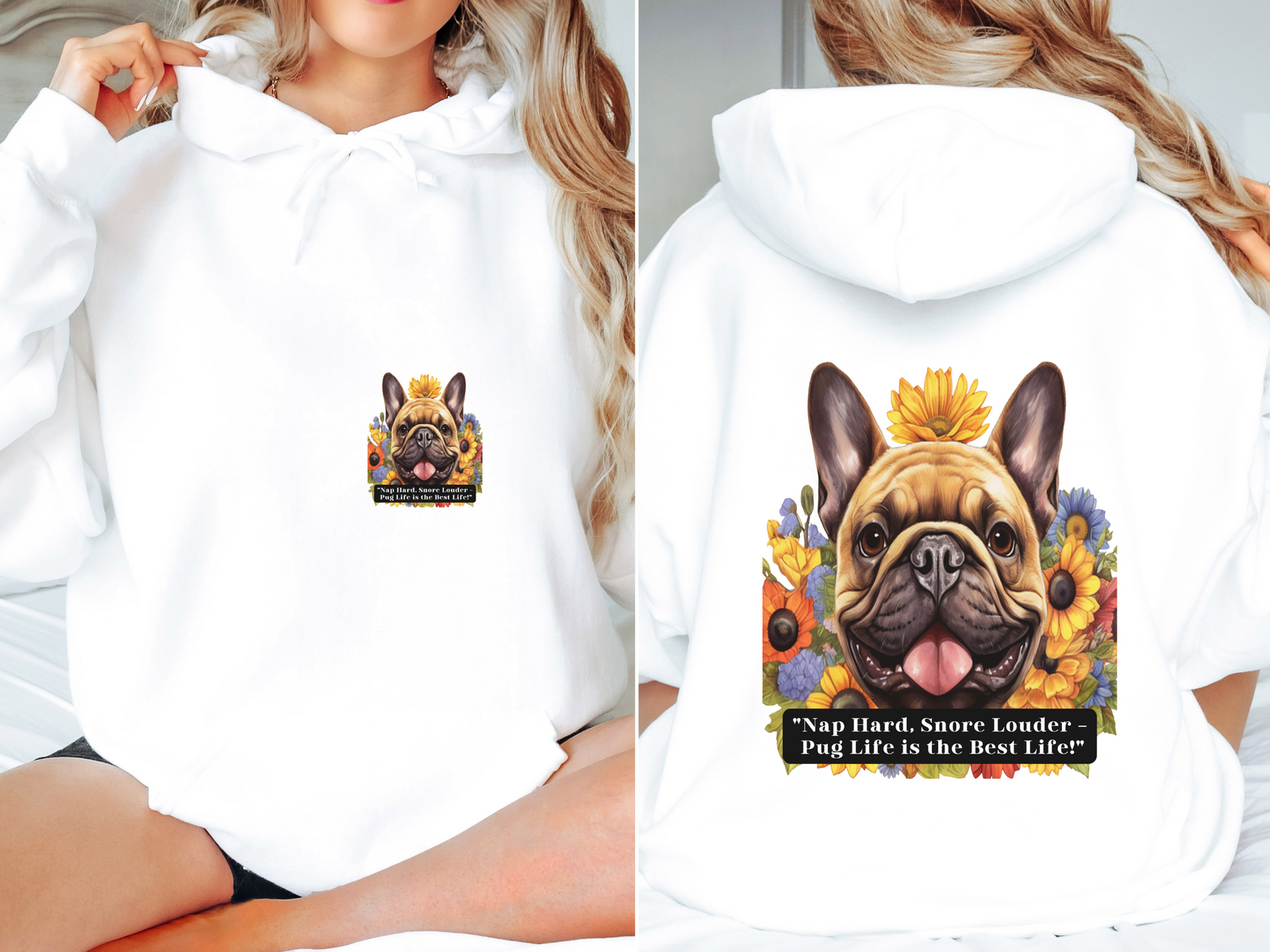 $17.99 USD"Pug Life Sunflower Hoodie – 'Nap Hard, Snore Louder' – Unisex Cozy Pug Lover Pullover"