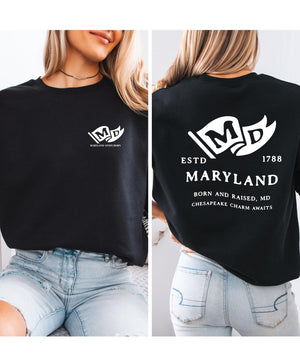 Celebrate your Maryland roots with our "Born and Raised" Sweatshirt! This cozy and stylish sweatshirt is perfect for anyone who proudly calls the Old Line State home. The front features a bold "Born and Raised" slogan, while the back showcases a detailed Maryland state outline with a heart marking your hometown pride. Made from premium, soft fabric, this sweatshirt is ideal for cool evenings, outdoor adventures, or simply showing off your Maryland pride. Whether you're a lifelong resident or a proud supporter of the Free State, this sweatshirt is a must-have addition to your wardrobe