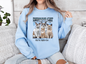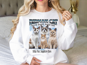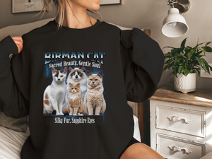 Wrap yourself in elegance and warmth with this Unisex Birman Cat Bootleg Collage Sweatshirt, a soft, cozy tribute to one of the world’s most graceful feline breeds. With vintage-style bootleg collage artwork, this sweatshirt highlights the stunning blue eyes, creamy coat, and gentle spirit of the beloved Birman cat.