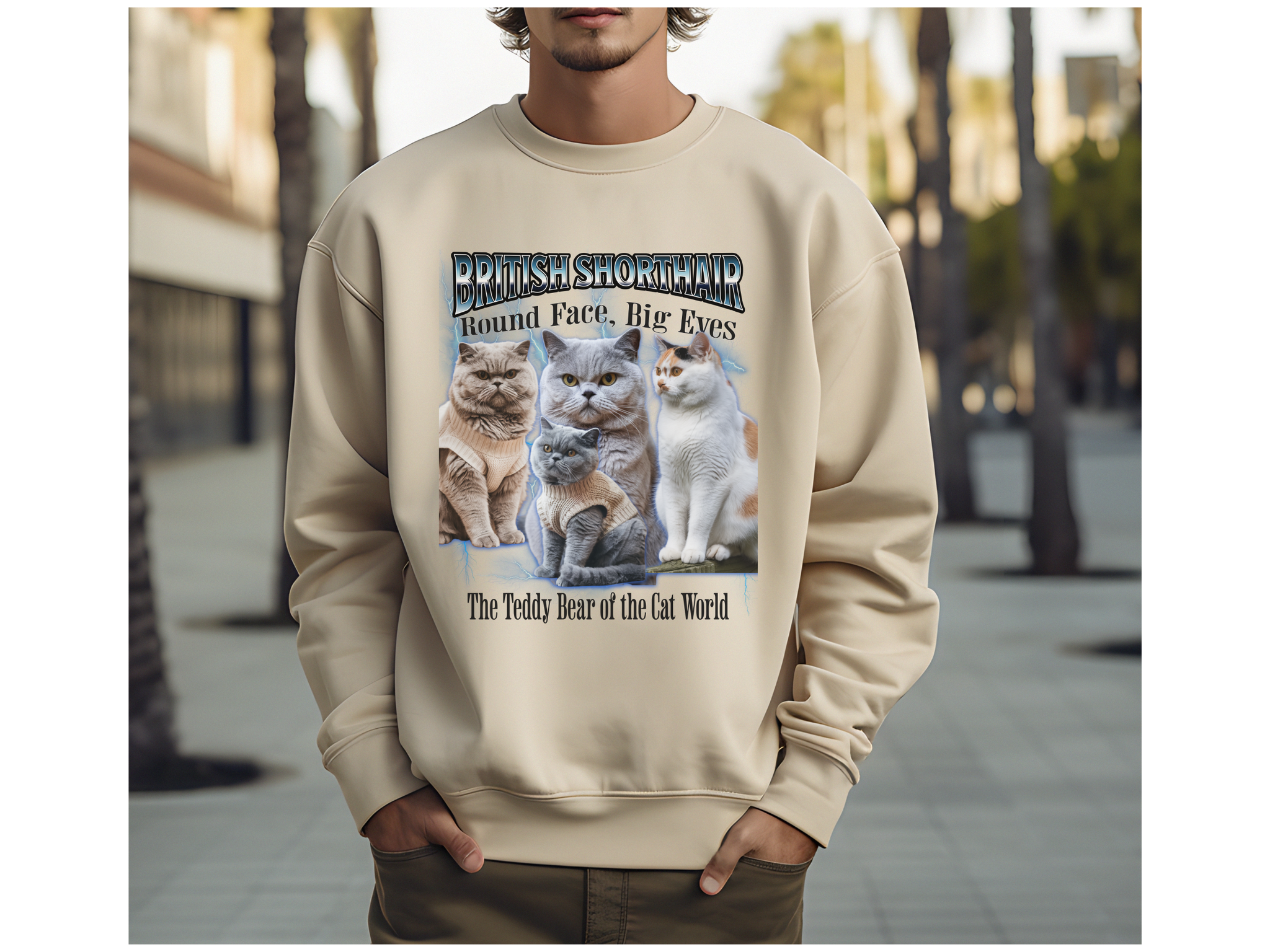 Unisex British Shorthair Cat Bootleg Collage Sweatshirt – “Round Face, Big Eyes” Retro Cat Lover Pullover