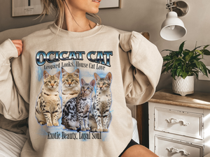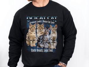 Fierce in appearance, gentle at heart—this Unisex Ocicat Cat Bootleg Collage Sweatshirt is perfect for those who love a wild aesthetic with a domestic twist. Featuring bold bootleg-inspired collage artwork, this pullover highlights the Ocicat’s exotic spots and lovable personality.
