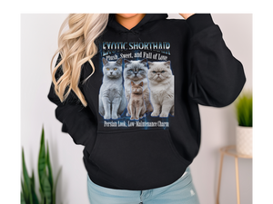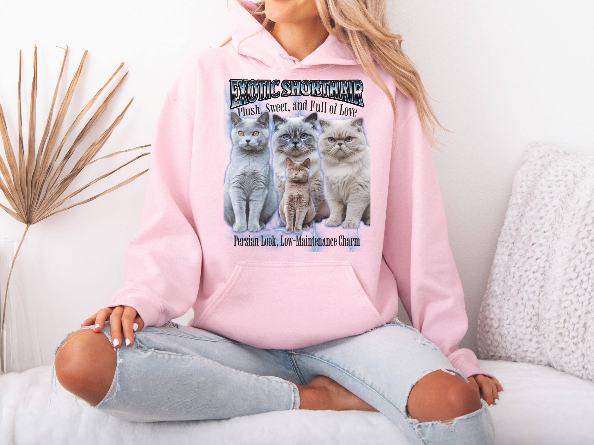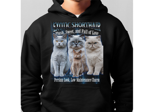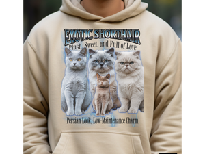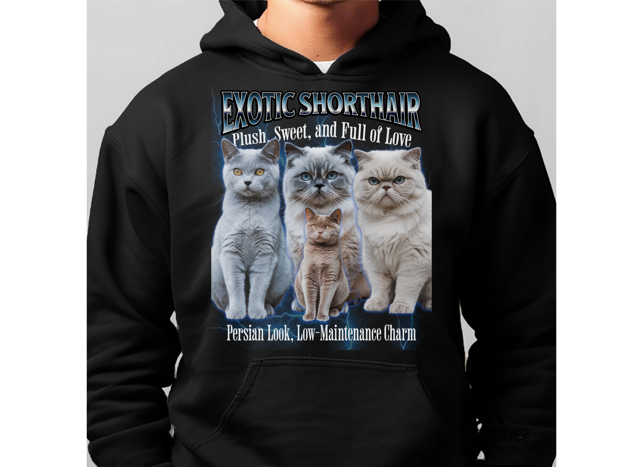 Bring quirky charm and iconic style into your wardrobe with this Unisex Exotic Shorthair Cat Bootleg Collage Hoodie. Known for their adorable flat faces and teddy bear looks, the Exotic Shorthair is a fan favorite — and this hoodie captures their lovable vibe in a bold, vintage-inspired bootleg graphic that stands out from the crowd.