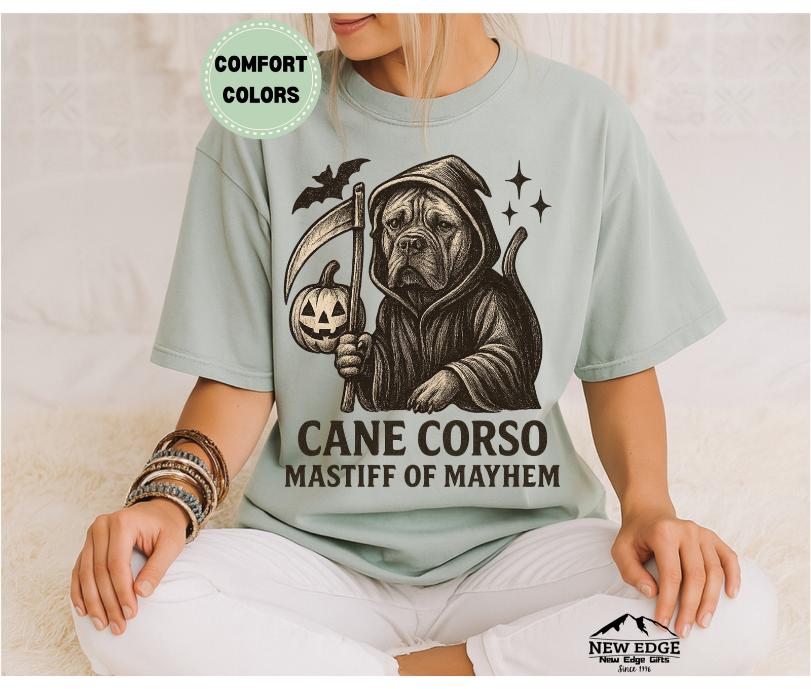 Unisex Comfort Colors Cane Corso – Mastiff of Mayhem Halloween T-Shirt | Spooky Dog Pun Tee