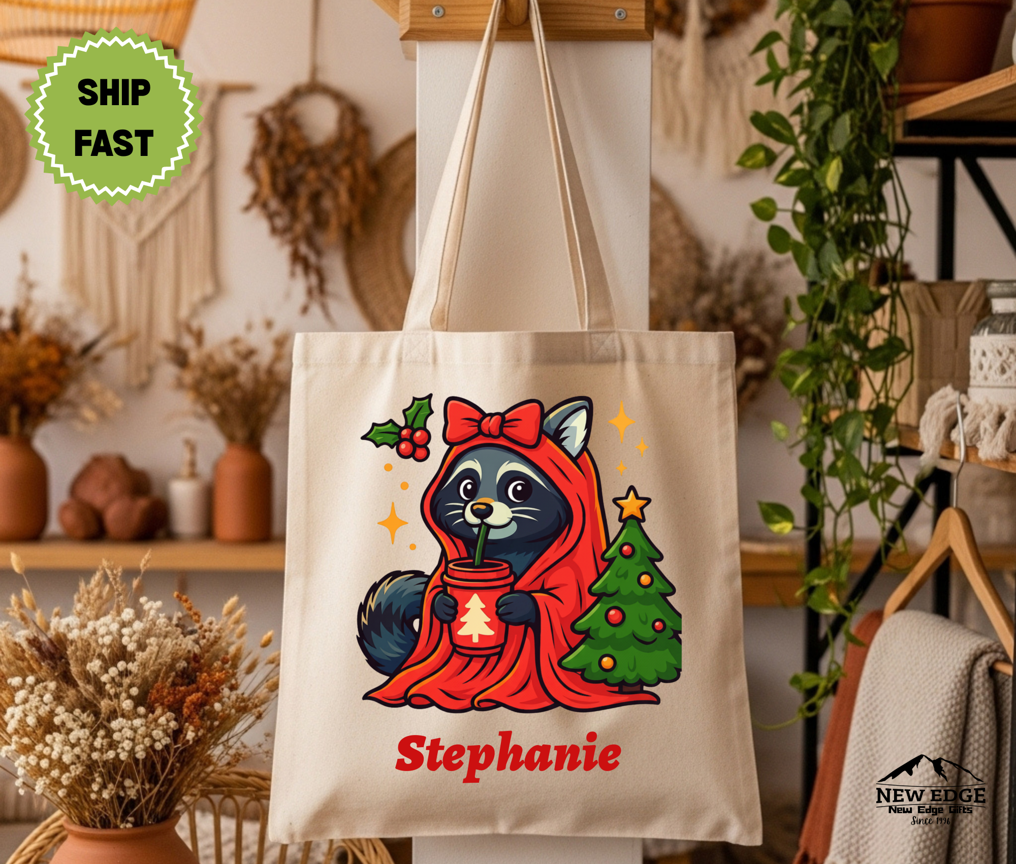 from $19.54 USDPersonalized Christmas Tote Bag – Cute Raccoon in Orange Hooded Robe with Bow by Christmas Tree, Cotton Canvas Shopping Bag
