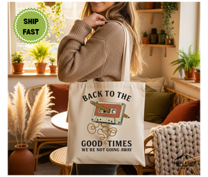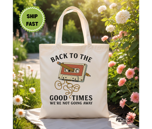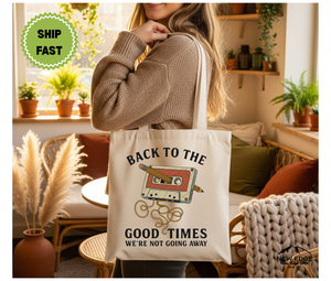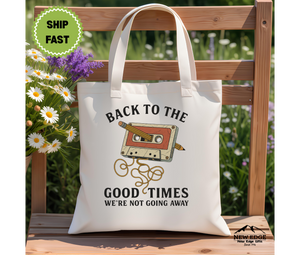 Retro Cassette Tape Tote Bag – “Good Times We’re Not Going Away” Cotton Canvas Reusable Bag, Vintage Music Lover Gift, 80s Aesthetic Bag