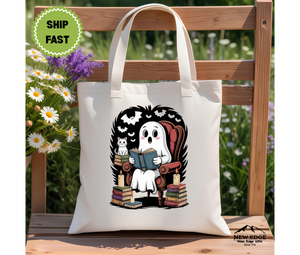 Ghost Reading Book Halloween Tote Bag – Spooky Book Lover Cotton Canvas Bag, Cute Fall Library Tote, Bookworm Halloween Gift
