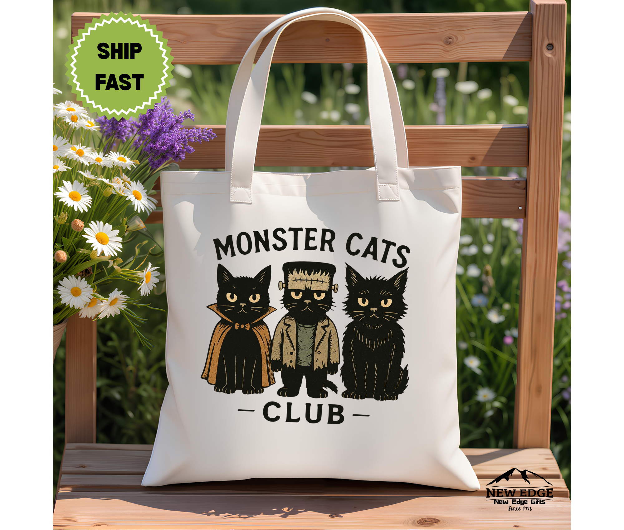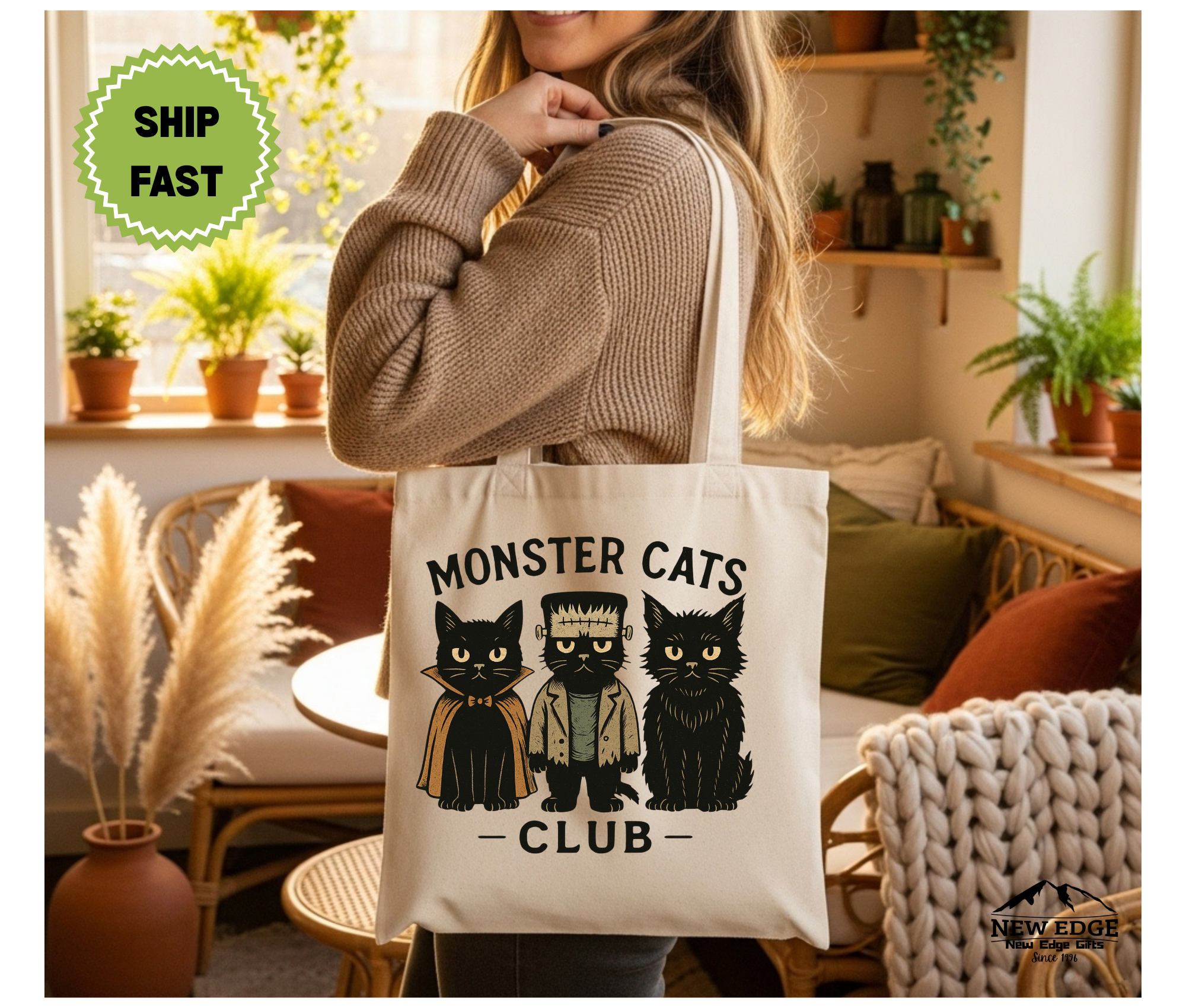 Monster Cats Club Halloween Tote Bag – Three Gangster Cats Cotton Canvas Bag, Funny Spooky Cat Lover Gift, Cool Halloween Tote