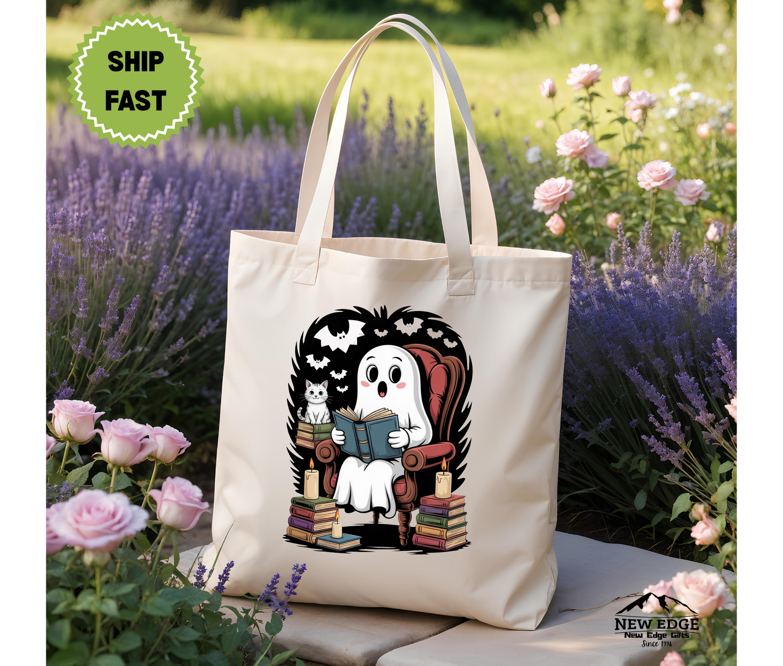 $15.80 USDGhost Reading Book Halloween Tote Bag – Spooky Book Lover Cotton Canvas Bag, Cute Fall Library Tote, Bookworm Halloween Gift