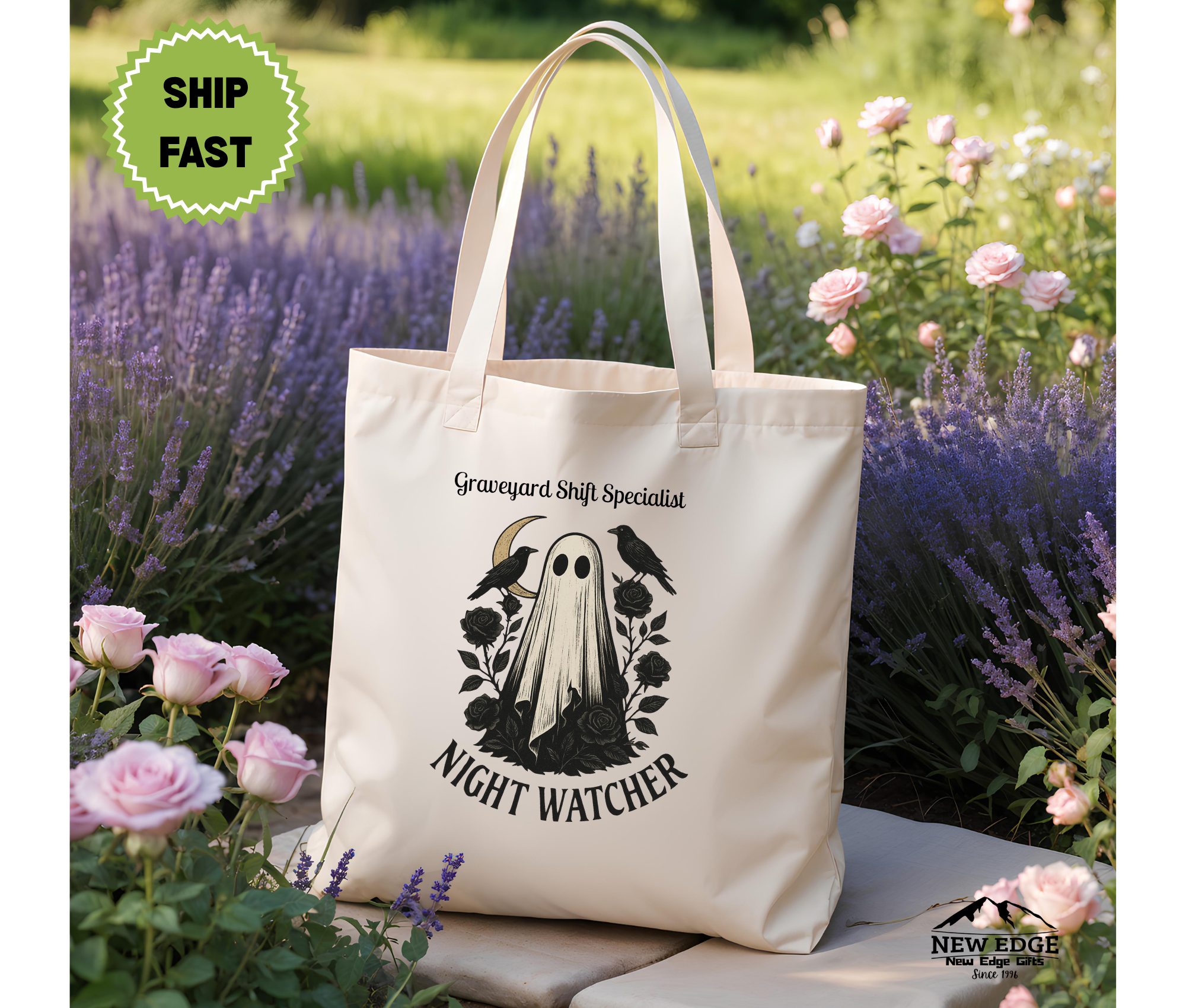 $15.80 USDNight Watcher Halloween Tote Bag – Ghost with Black Flower “Graveyard Shift Specialist” Cotton Canvas Bag, Gothic Spooky Fall Gift