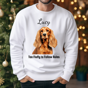 Wrap yourself in cozy comfort and dog-lover pride with this personalized Cocker Spaniel sweatshirt featuring the playful slogan “Too Fluffy to Follow Rules.” Perfect for anyone who can’t resist those big puppy eyes and soft floppy ears, this unisex crewneck makes a heartwarming gift for the holidays or any special occasion.