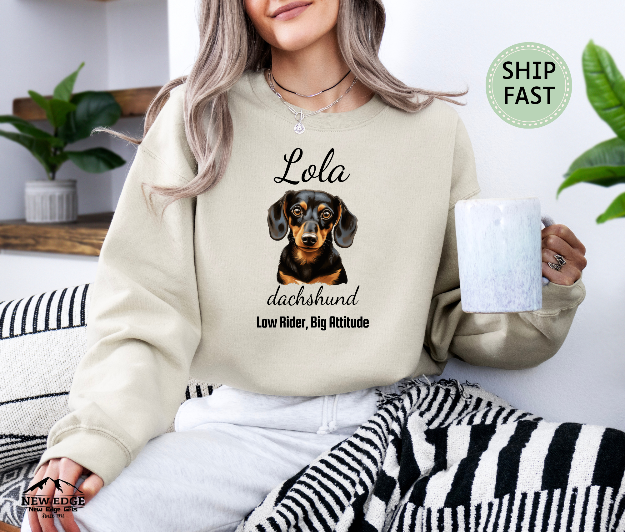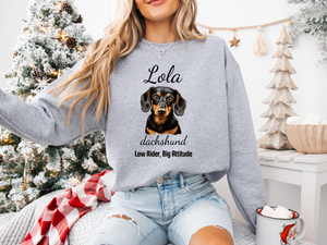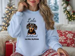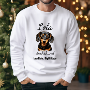 Celebrate your sassy little pup with this Dachshund Personalized Unisex Sweatshirt, featuring the playful slogan “Low Rider, Big Attitude.” Perfect for dog moms, dads, and Dachshund enthusiasts, this cozy sweatshirt combines humor and personal style. Add your dog’s name or custom illustration to make it uniquely yours. Made with soft, premium fabric, it’s ideal for everyday wear, dog walks, or as a thoughtful gift for any proud Dachshund parent.