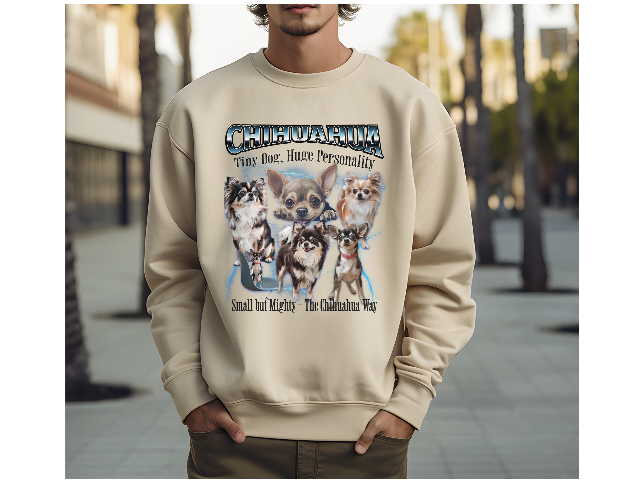 Small in size but mighty in spirit, the Chihuahua commands attention with its bold personality and unwavering loyalty. This Unisex Bootleg Collage Sweatshirt captures the essence of this spirited breed with a vintage-inspired design that showcases their larger-than-life character.