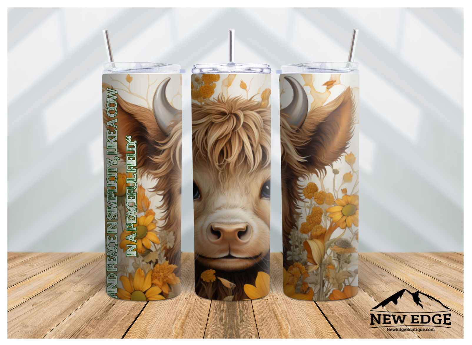 Introducing the FROM NEW EDGE 20 oz Domestic Animal Skinny Tumbler, a unique and empowering addition to your daily routine. With the inspirational slogan, "Embrace calmness and resilience, like a steady cow," this tumbler embodies the enduring strength and unwavering tranquility of one of nature's most steadfast creatures.