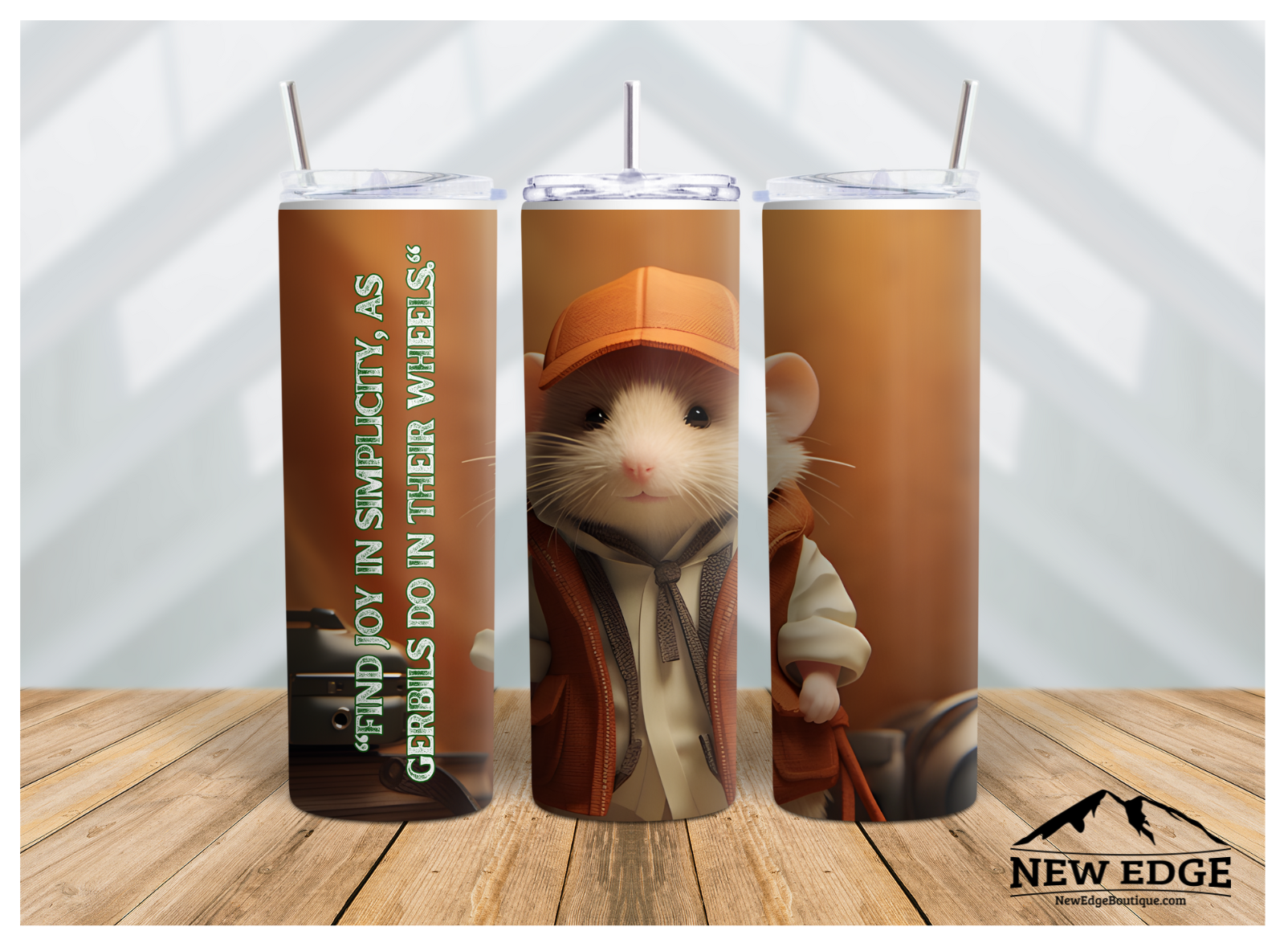The standout feature of this tumbler is the charming slogan: "Find joy in simplicity, as gerbils do in their wheels." This message serves as an everyday inspiration to embrace the uncomplicated moments, much like gerbils find sheer delight in running in their wheels.
