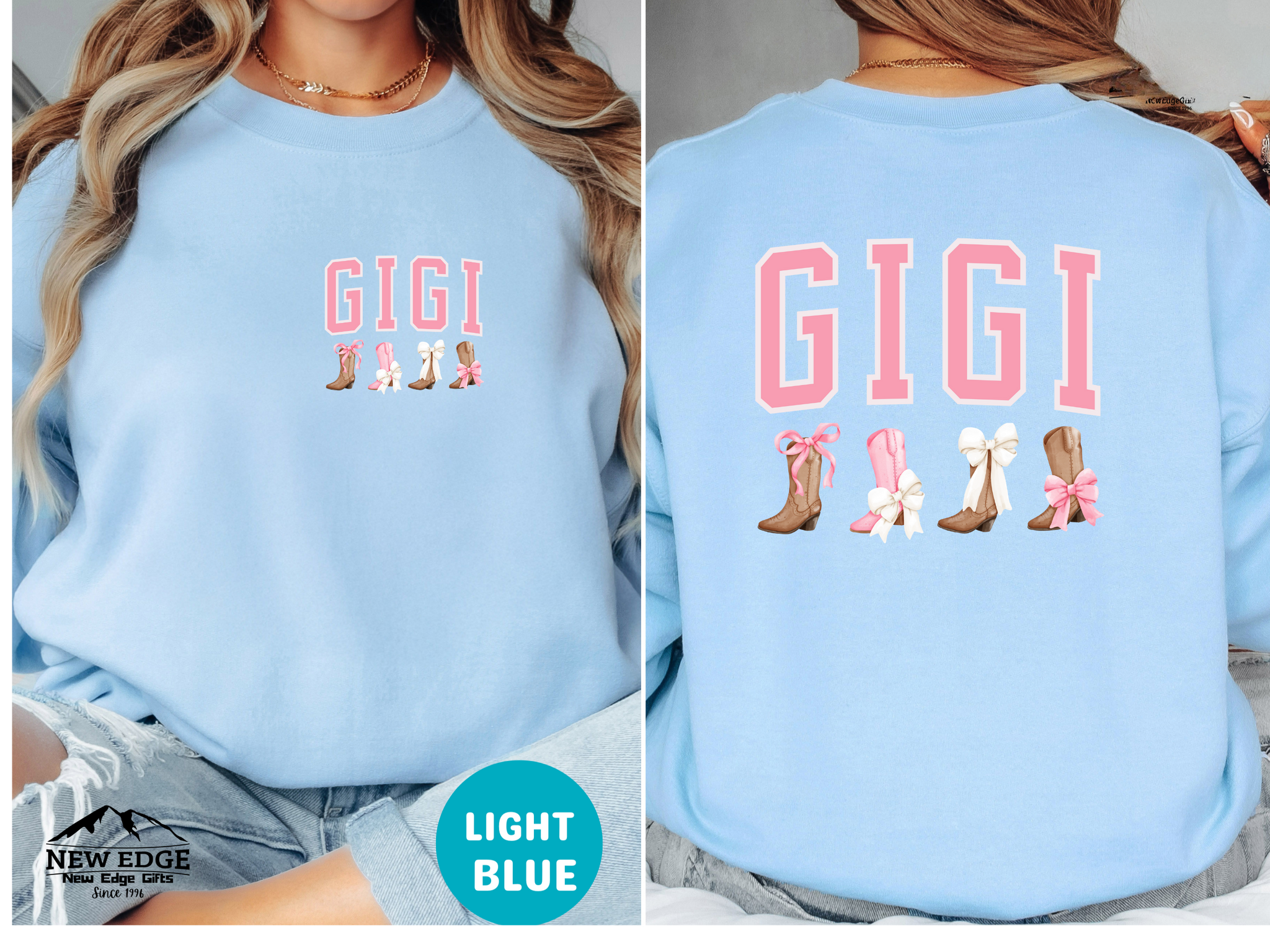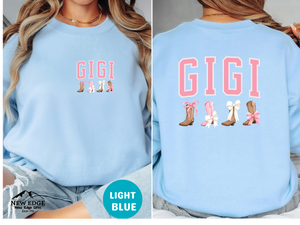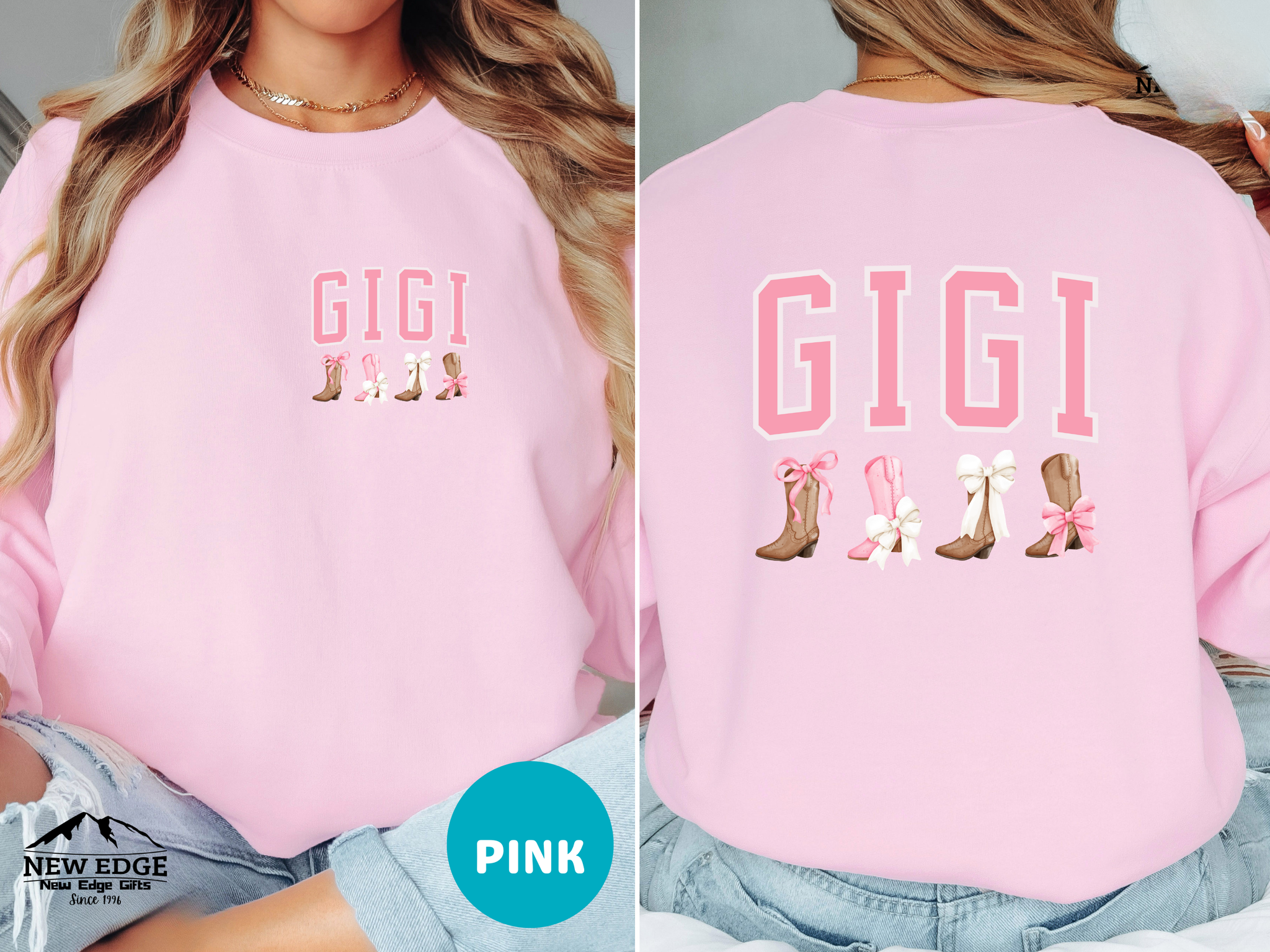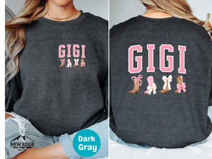 Celebrate your Gigi in style with our GIGI Sweatshirt, featuring a playful front and back design of cowboy boots adorned with feminine bows. This cozy and stylish sweatshirt perfectly blends western charm with the soft, girly coquette aesthetic—making it a fun statement piece for any Gigi who loves fashion with personality.