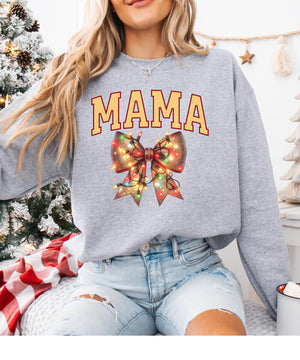 Bring holiday cheer and festive flair with this Mama Christmas Sweatshirt featuring a bow and Christmas lights design. Made from a soft, warm fabric blend with a relaxed unisex fit, this cozy crewneck is perfect for family gatherings, holiday photos, or casual winter days. Its playful holiday-themed graphic makes it a fun and thoughtful gift for moms who love Christmas, cozy comfort, and festive fashion.