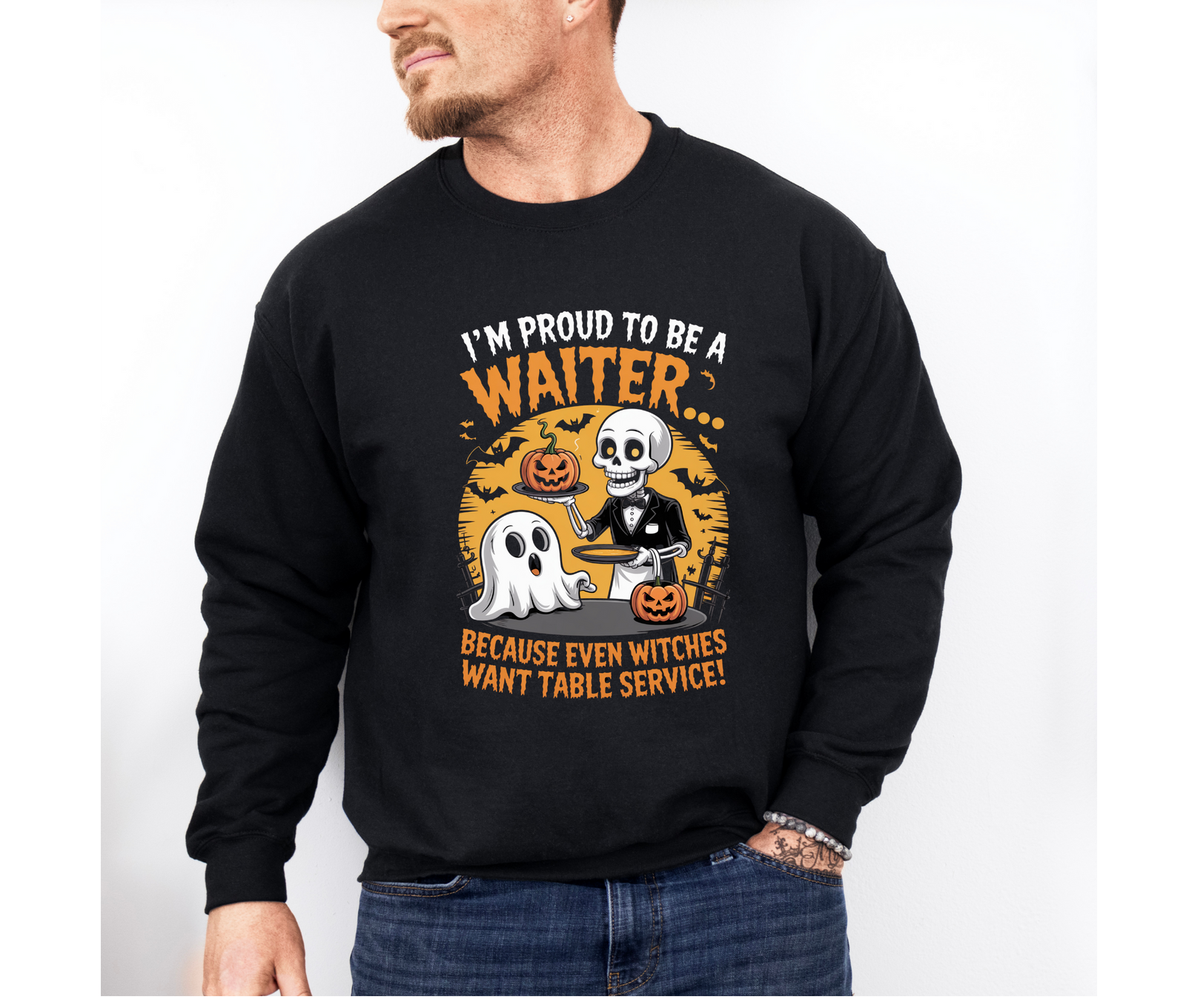 from $31.82 USDProud to Be a Waiter Halloween Sweatshirt – “Because Even Witches Want Table Service!” | Unisex Funny Spooky Server Crewneck