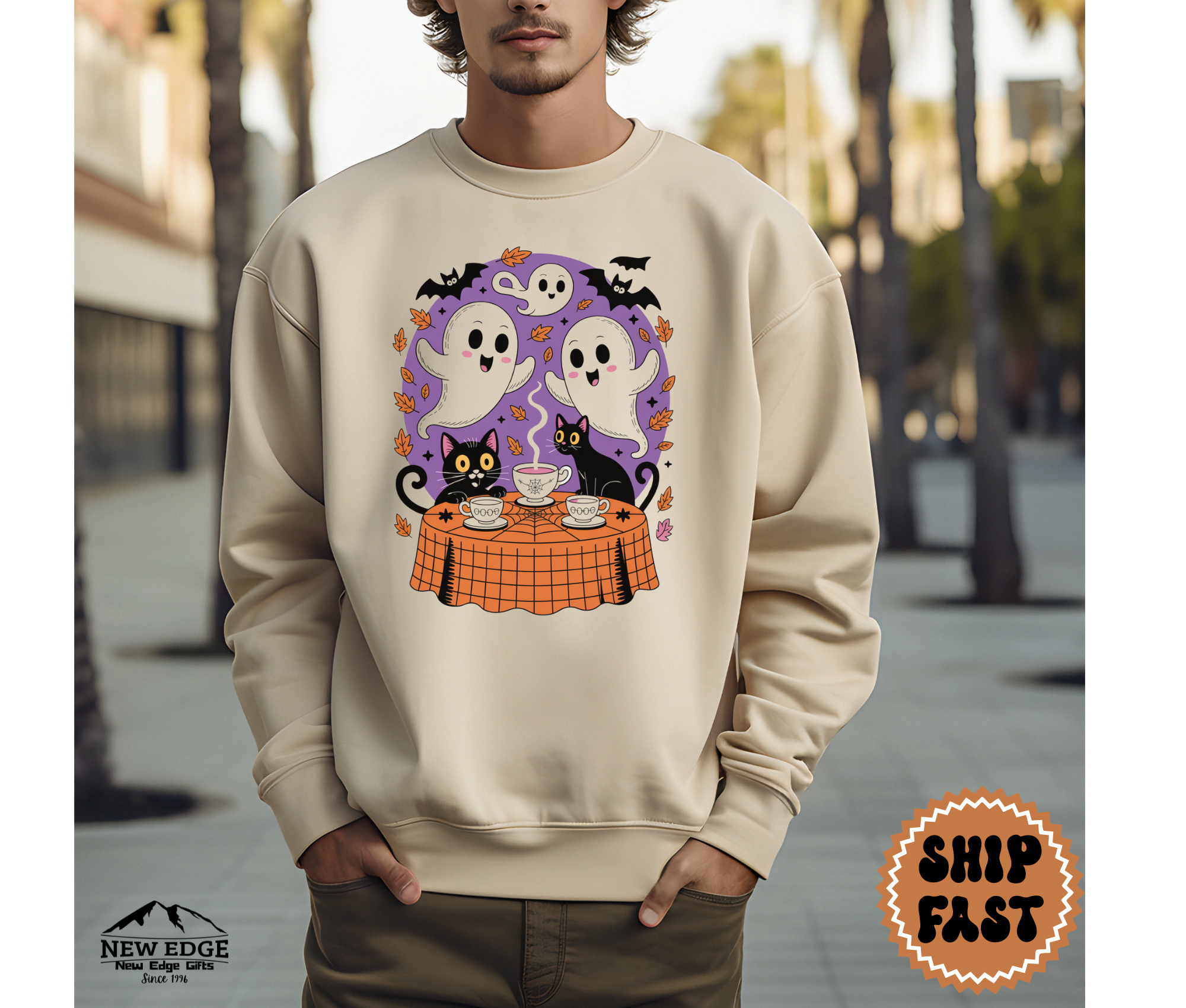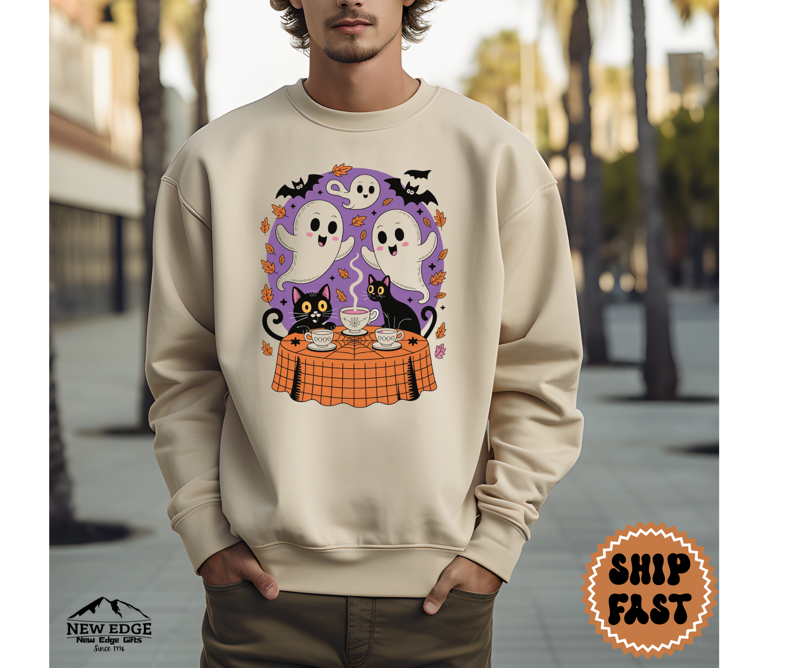 from $31.82 USDUnisex Ghost and Cat Tea Party Halloween Sweatshirt | Spooky Cozy Pullover | Cute Gothic Fall Crewneck