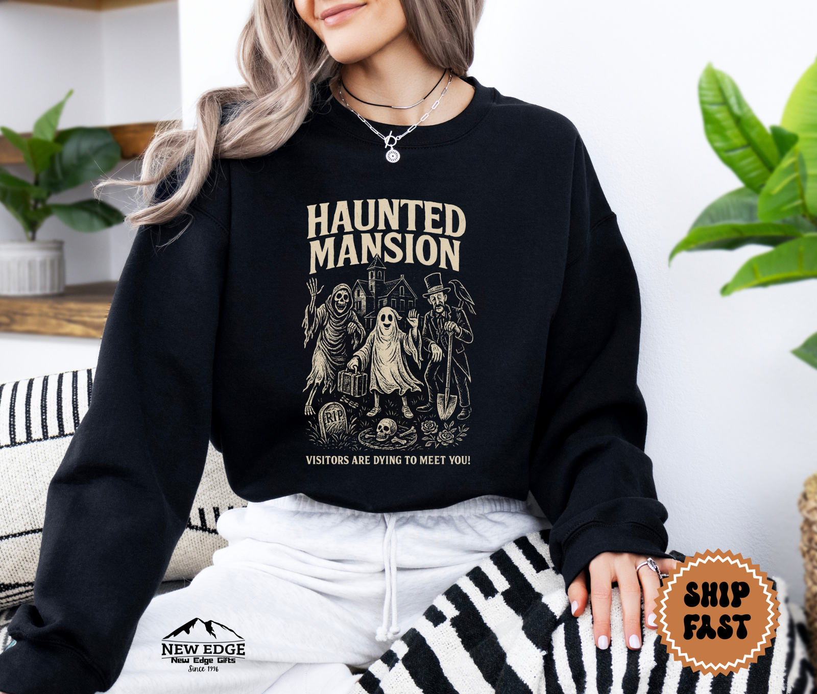 from $31.82 USDUnisex Haunted Mansion “Visitors Are Dying to Meet You” Halloween Sweatshirt | Gothic Haunted House Crewneck Pullover