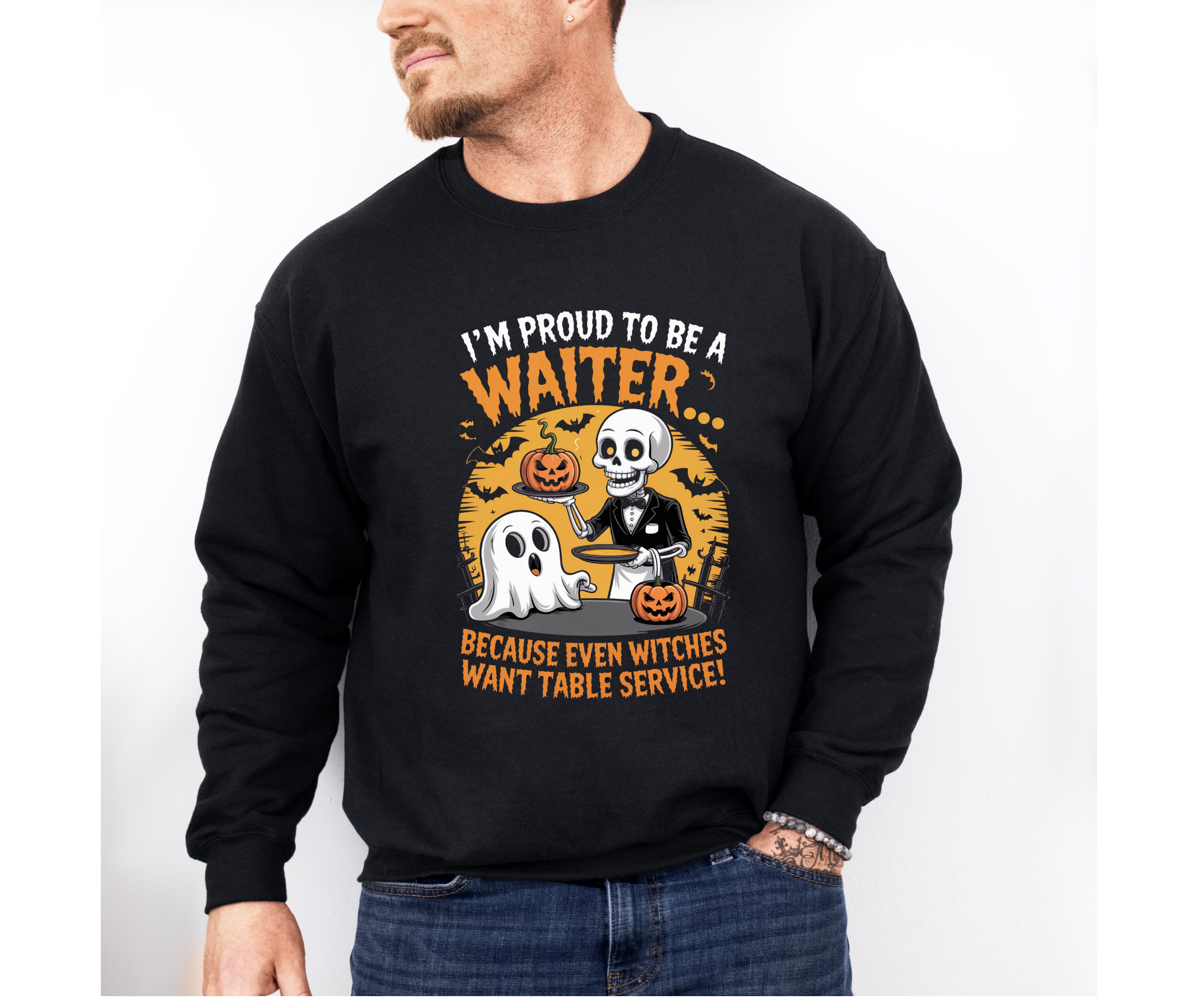 Proud to Be a Waiter Halloween Sweatshirt – “Because Even Witches Want Table Service!” | Unisex Funny Spooky Server Crewneck