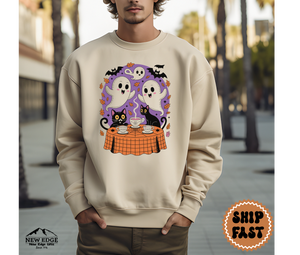 Sip in spooky style with this Ghost and Cat Tea Party Halloween Sweatshirt – the perfect mix of creepy and cute for your fall wardrobe. 🐾👻☕