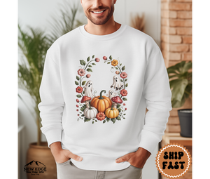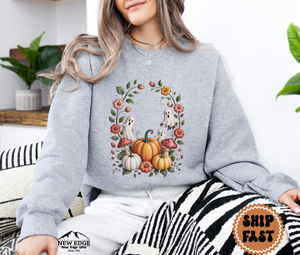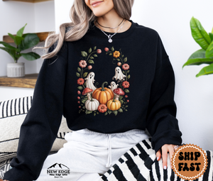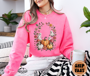 The design features a whimsical ghost surrounded by floral accents, making it a unique twist on traditional Halloween apparel. Whether you’re headed to a pumpkin patch, a Halloween party, or just sipping cocoa on a chilly autumn night, this sweatshirt adds the perfect mix of spooky and sweet.