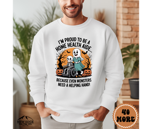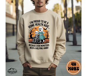 Celebrate spooky season while showing pride in your caregiving role! 🧟♀️🤲 This unisex Halloween Home Health Aide Sweatshirt features the playful slogan “I’m Proud to be a Home Health Aide… Because Even Monsters Need a Helping Hand!” Perfect for caregivers, healthcare workers, and anyone who provides comfort and support with a touch of humor. Made with soft, cozy fabric, this crewneck is ideal for work, casual wear, or festive Halloween gatherings. A thoughtful and funny gift for home health aides who care for others every day—even the monsters of Halloween!