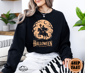 Featuring a chilling horseman design, complete with haunting details, this sweatshirt captures the spirit of spooky folklore and fall festivities. Whether you’re heading to a haunted house, enjoying a bonfire, visiting the pumpkin patch, or just lounging with autumn vibes, this pullover is designed to keep you warm and stylish.