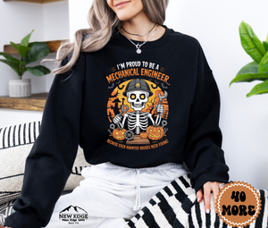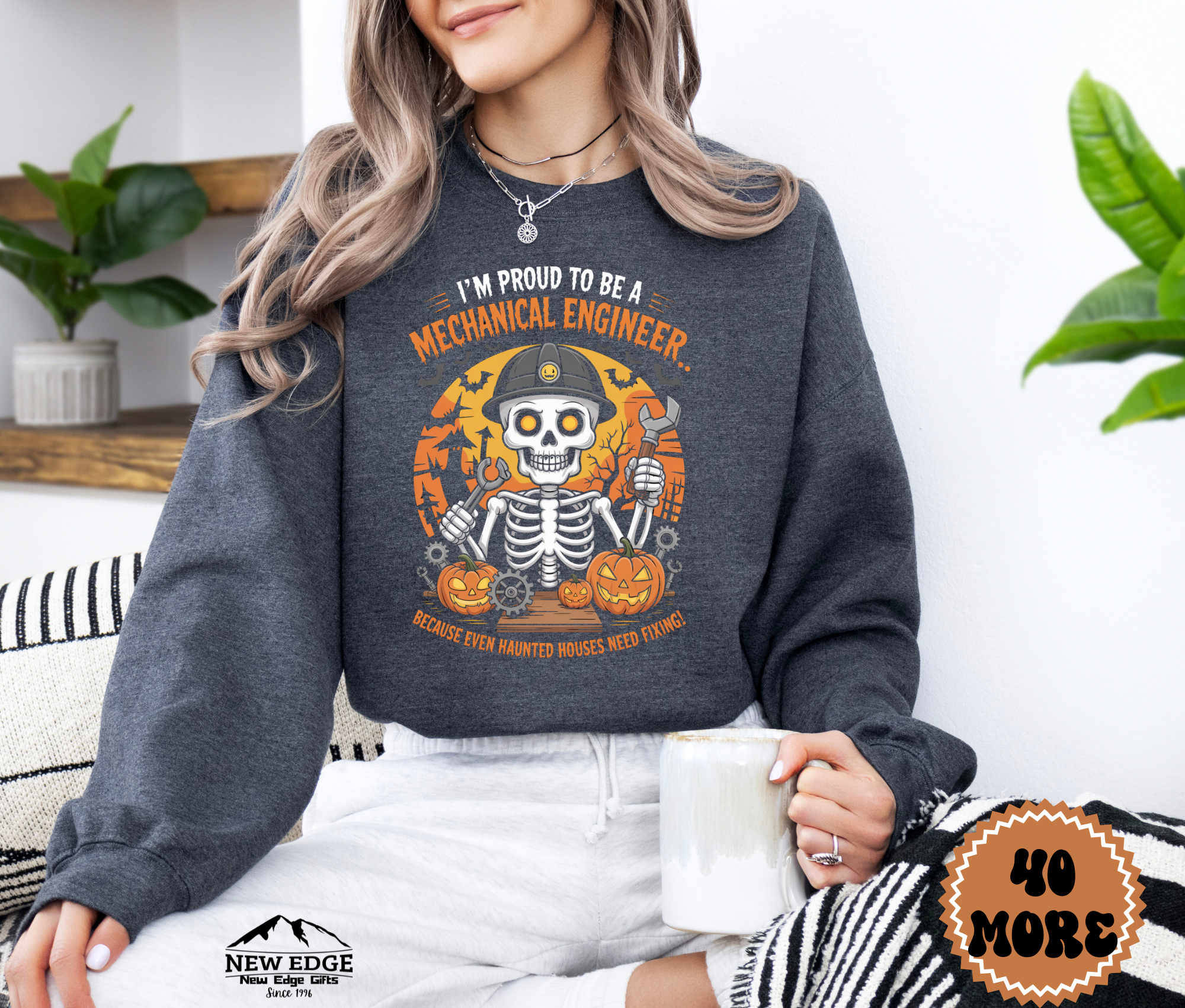 Unisex Halloween Mechanical Engineer Sweatshirt – “I’m Proud to be a Mechanical Engineer… Because Even Haunted Houses Need Fixing!” Funny Profession Crewneck