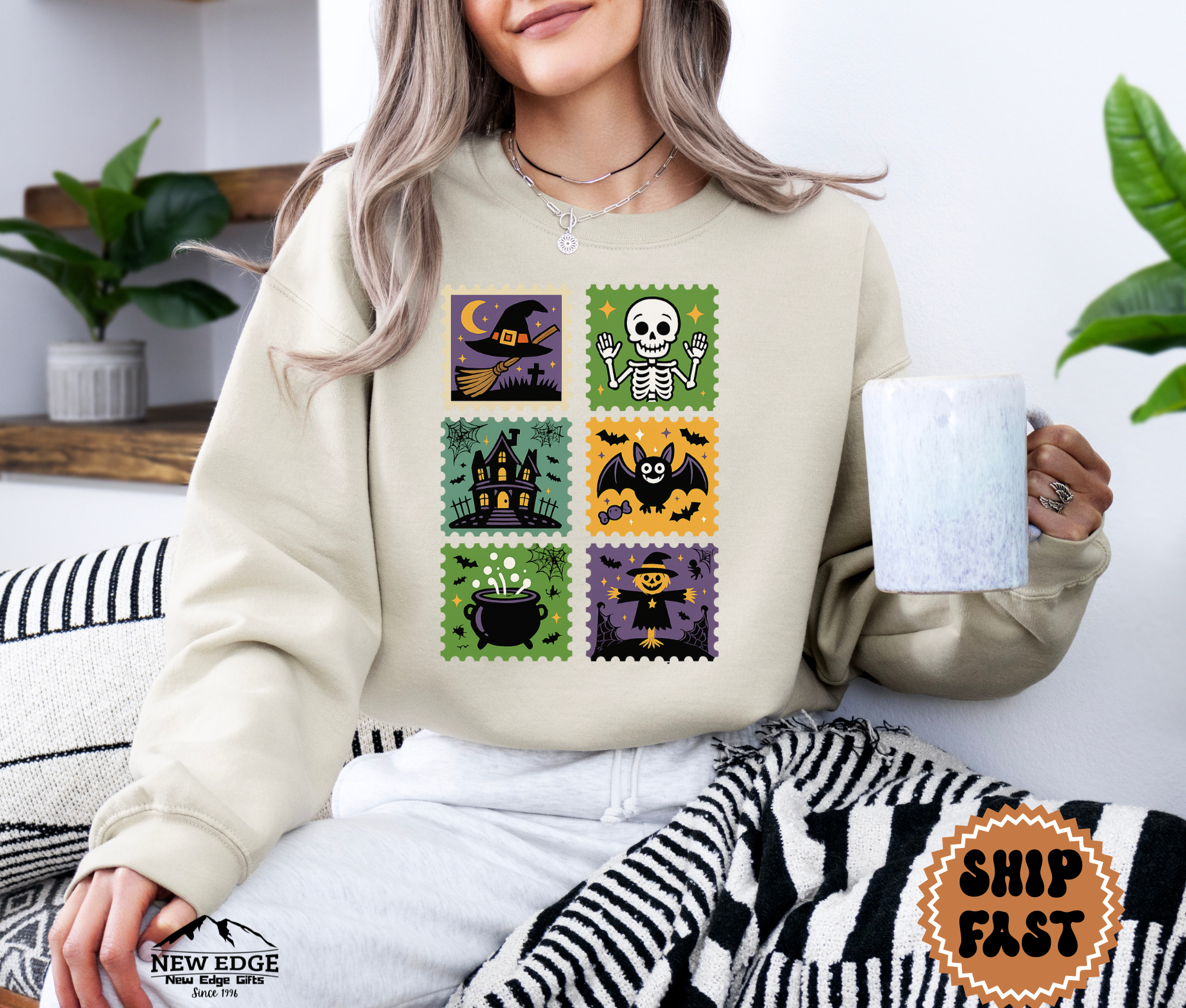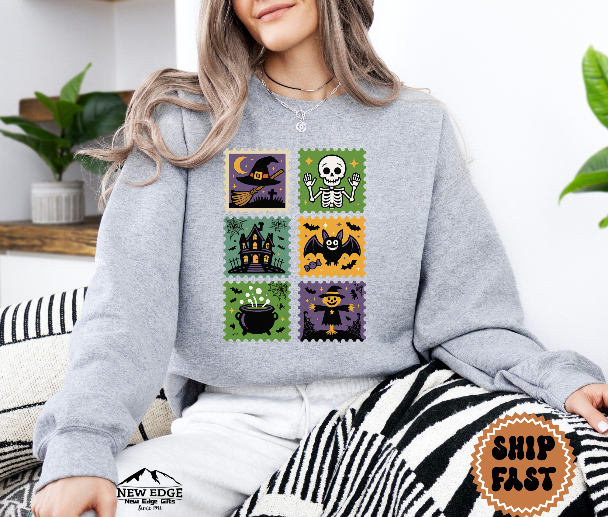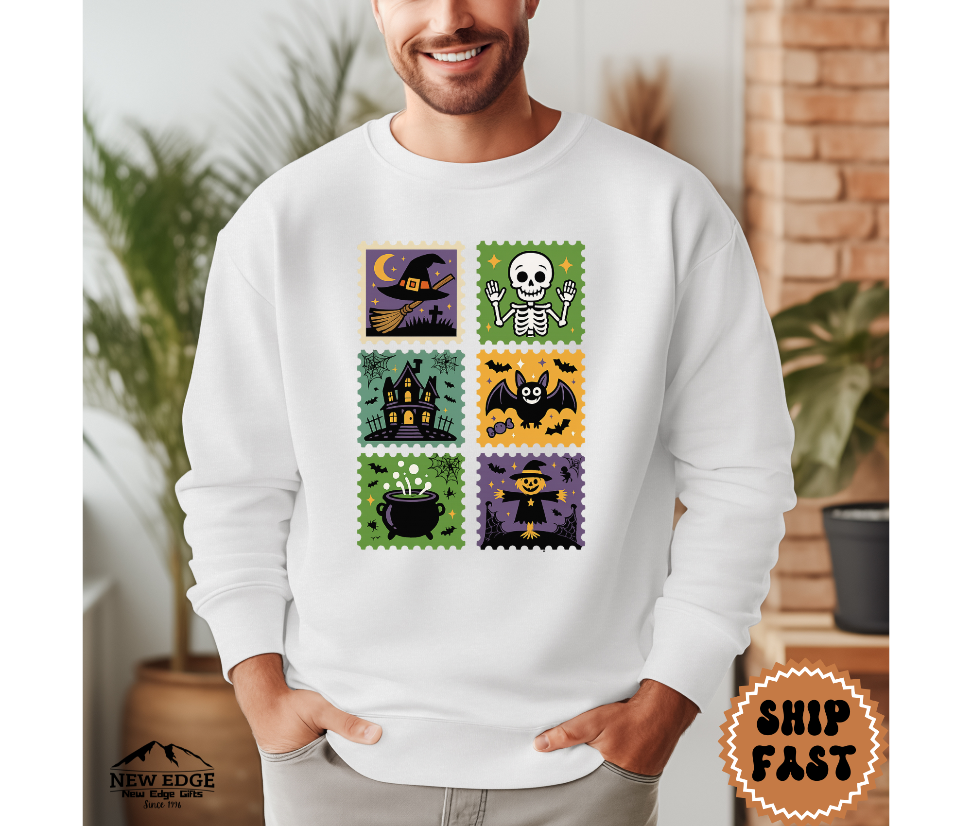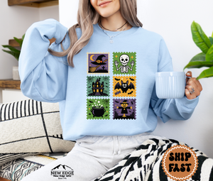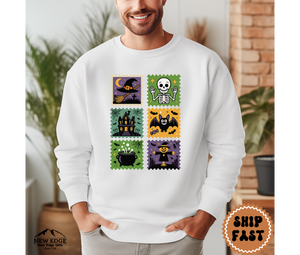 Step into spooky season style with this Postage Stamp Halloween Sweatshirt! Featuring six vintage-inspired Halloween stamp designs, this cozy pullover showcases all the classic favorites: a witch’s hat, smiling skeleton, haunted house, cheerful bat, bubbling cauldron, and a festive scarecrow. Perfect for both men and women, this unisex sweatshirt is soft, comfortable, and ideal for chilly fall nights, pumpkin carving, trick-or-treating, or simply lounging in Halloween spirit.