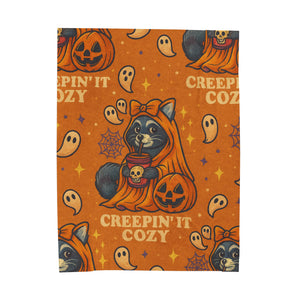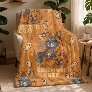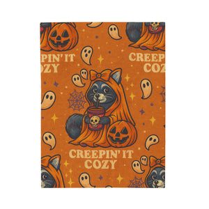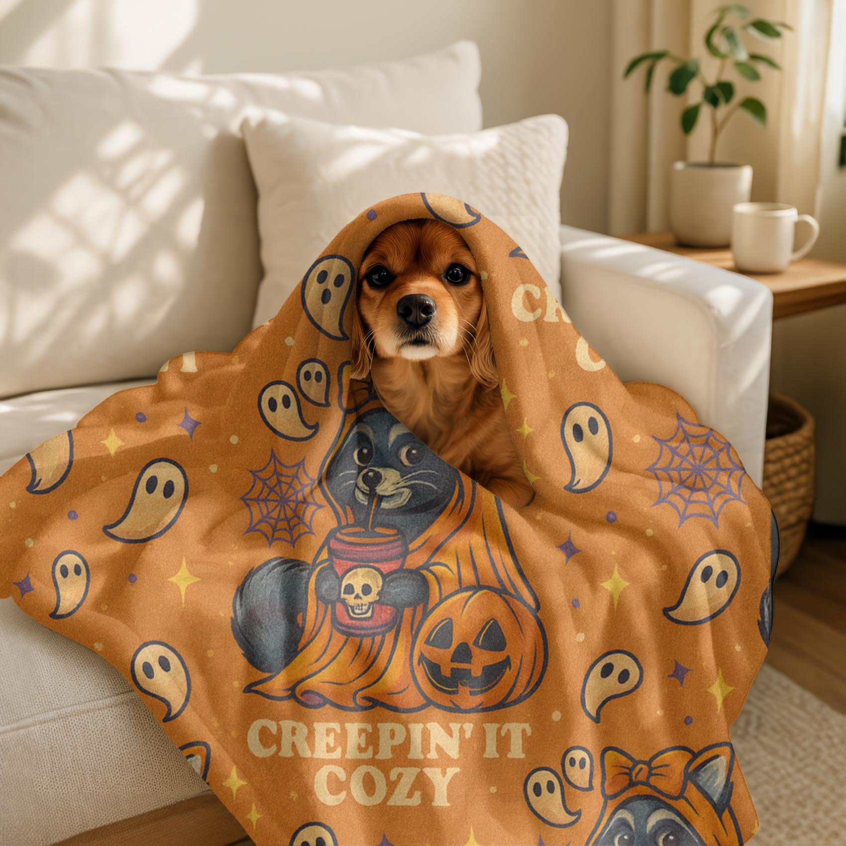 Get into the Halloween spirit with this velveteen blanket featuring a playful raccoon and the slogan “Creepin’ it Cozy.” Perfect for spooky movie nights, festive décor, or gifting to raccoon lovers. Super soft, durable, and seasonally stylish—only from New Edge Gifts & Novelties.