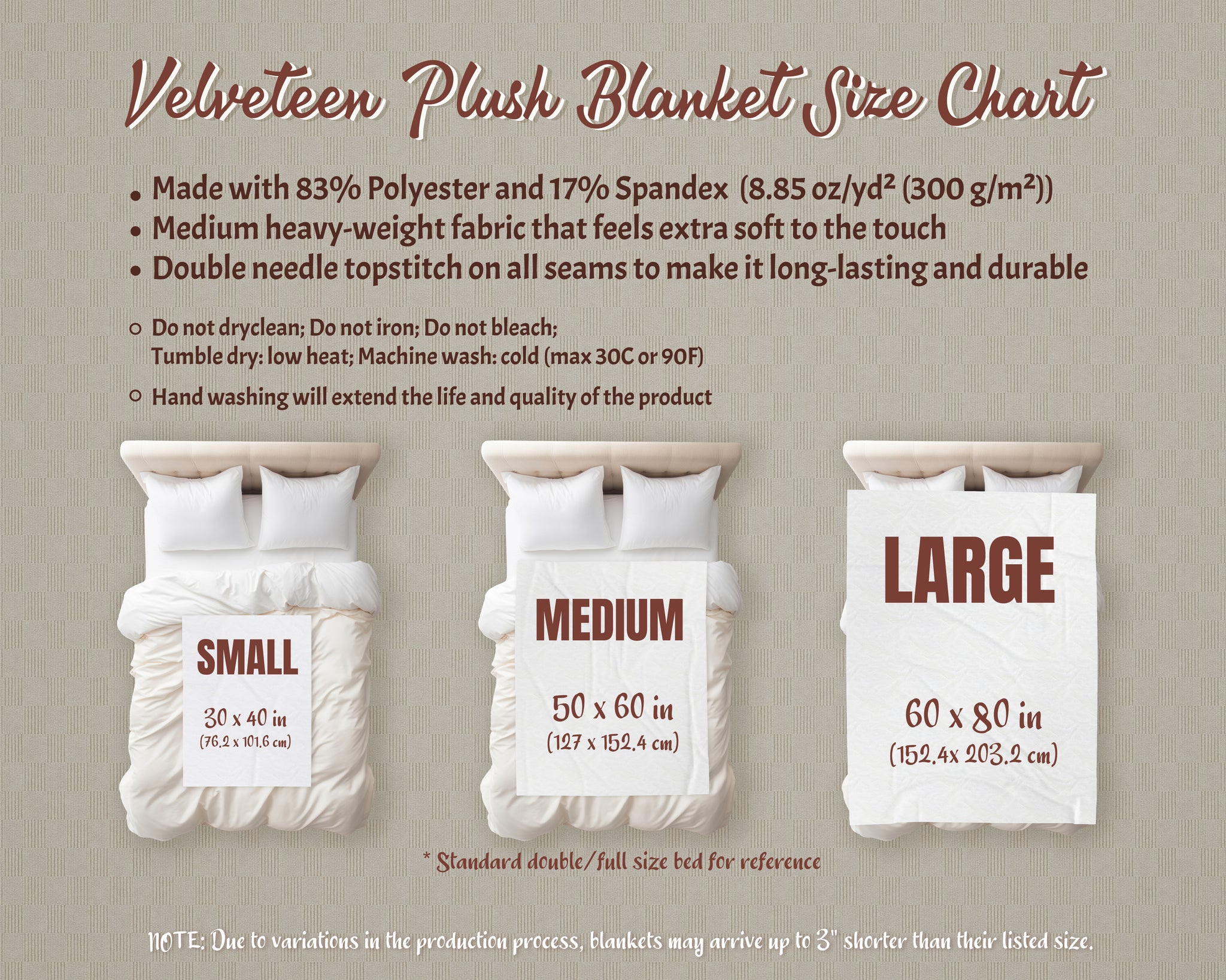 Create a cozy and warm atmosphere at home with this plush velveteen blanket. It is soft to touch and perfect for any home. Customize with a one-sided print to add your personal touch or create a gift for your friends and family. Available in three sizes: 30x40", 50x60", 60x80".