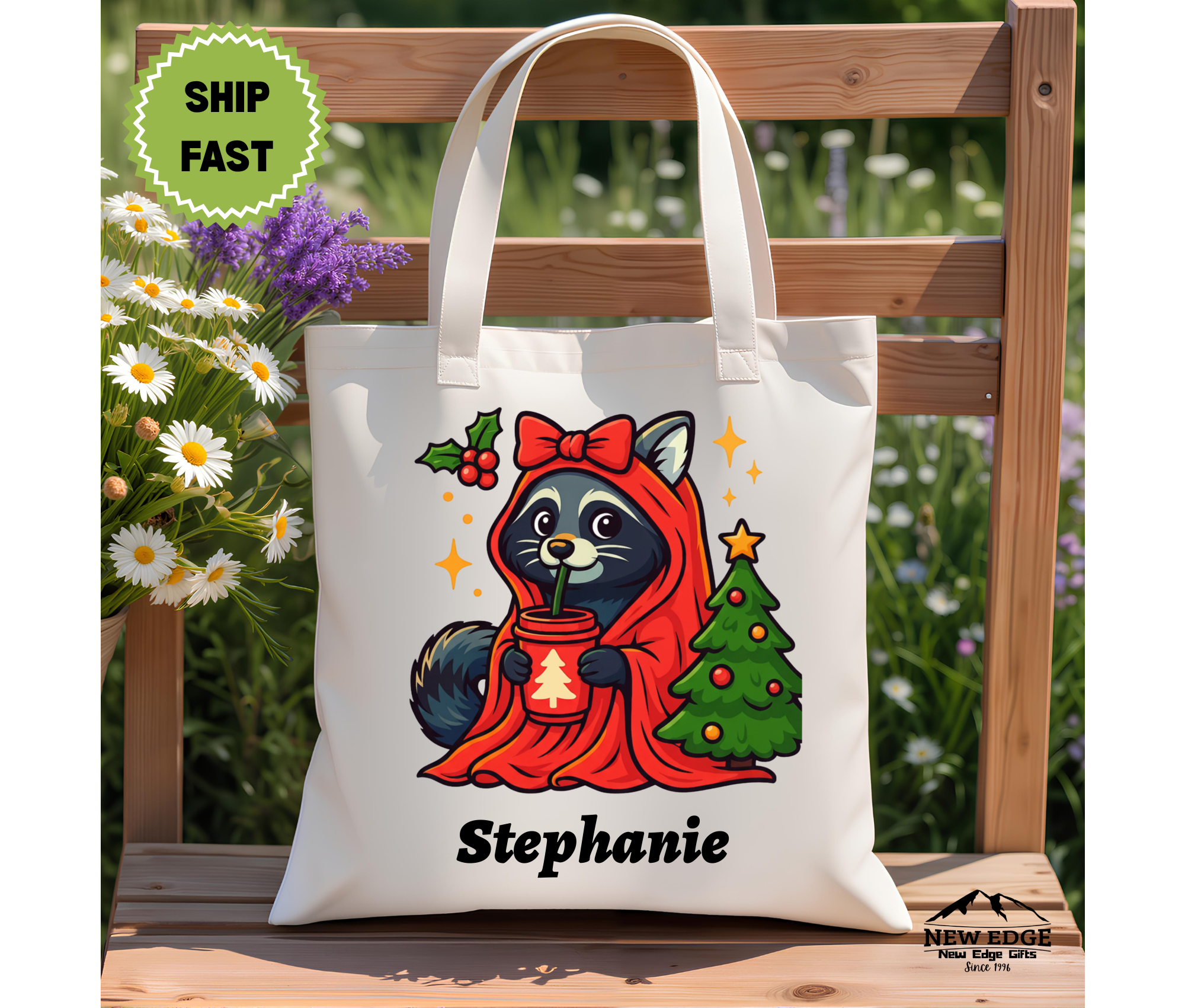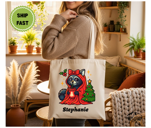 Make your holiday season extra merry with this Personalized Christmas Tote Bag featuring an adorable raccoon dressed in a cozy orange hooded robe with a sweet bow on its head, standing next to a beautifully decorated Christmas tree. Crafted from durable cotton canvas, this festive and reusable bag is perfect for holiday shopping, gift wrapping, or Christmas gifting. Add a name or special message to make it uniquely yours or a thoughtful personalized present.