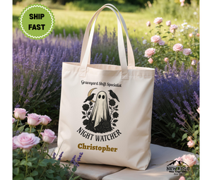 Personalized Halloween Tote Bag – Ghost with Black Flowers & Crows, “Night Watcher Graveyard Shift Specialist” Cotton Canvas Bag