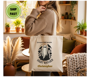 Step into the shadows of spooky season with this Personalized Halloween Tote Bag, featuring a haunting ghost surrounded by black flowers and crow birds. The bold slogan “Night Watcher Graveyard Shift Specialist” adds a chillingly playful touch. Made from durable cotton canvas, this reusable tote is perfect for trick-or-treating, fall shopping, or gifting to Halloween lovers. Personalize it with a name or phrase to make it extra special and unique.