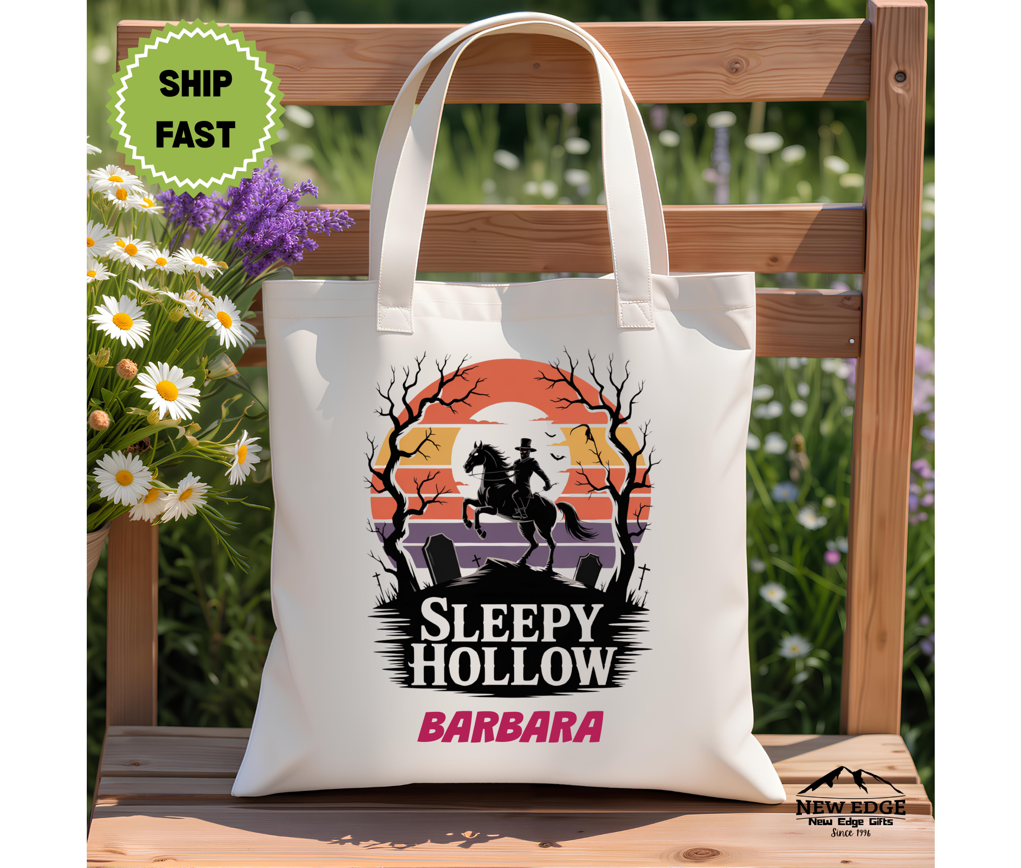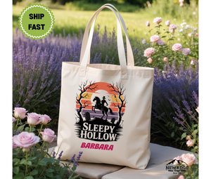 Step into the haunting world of Sleepy Hollow with this Personalized Halloween Tote Bag featuring the iconic Headless Horseman riding through a spooky graveyard. Crafted from durable cotton canvas, this reusable tote is perfect for trick-or-treating, Halloween festivals, or everyday errands with a chilling seasonal touch. Personalize it with a name or phrase to create a unique and unforgettable Halloween accessory or gift.