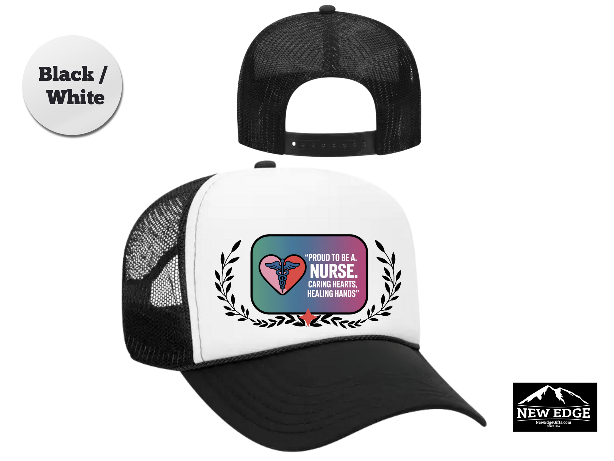 $18.99 USDNurse Trucker Hat – Proud to Be a Nurse | Caring Hearts, Healing Hands | Nurse Appreciation Gift Cap