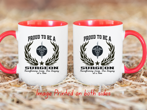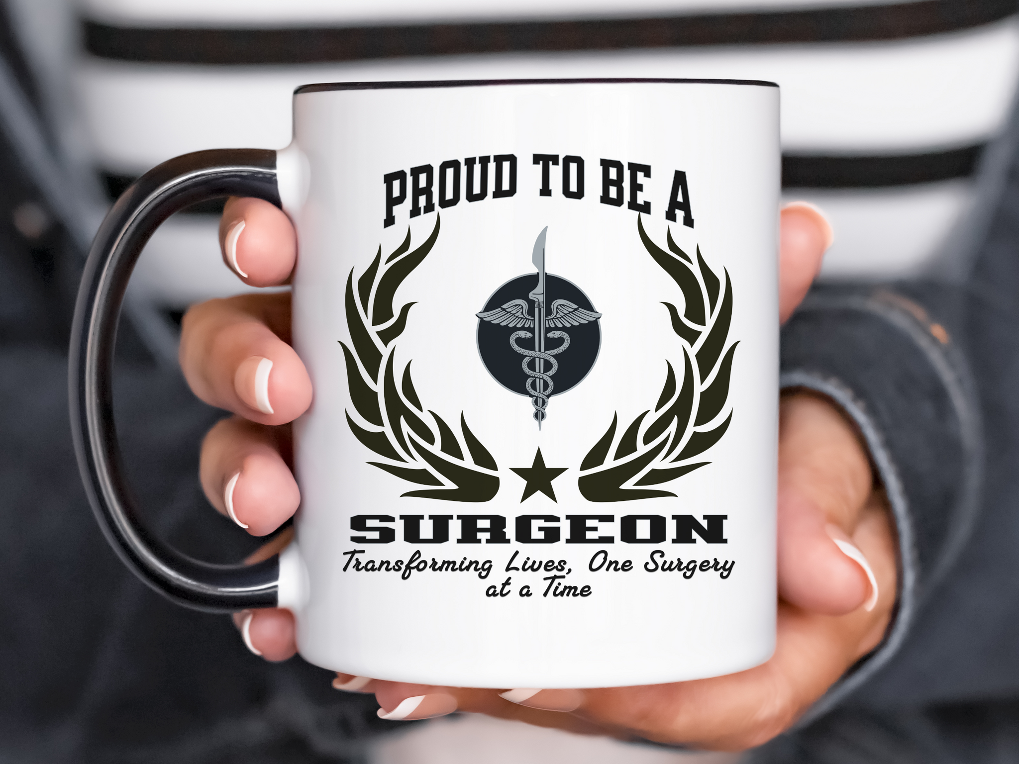 Celebrate the precision, dedication, and impact of surgical excellence with this premium “Proud to be a Surgeon” accent coffee mug from New Edge Gifts and Novelties. Featuring the empowering slogan: