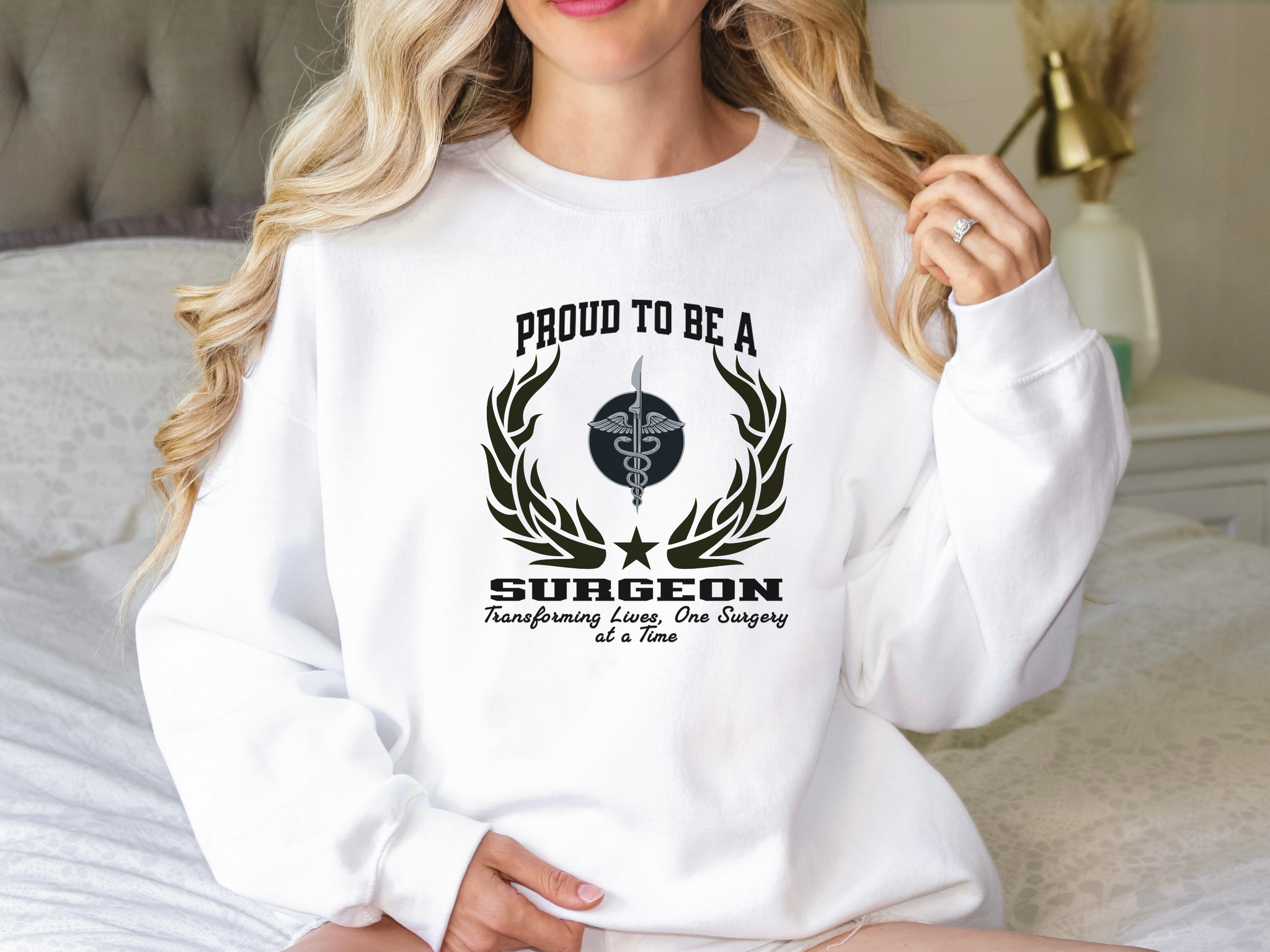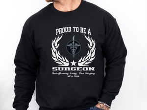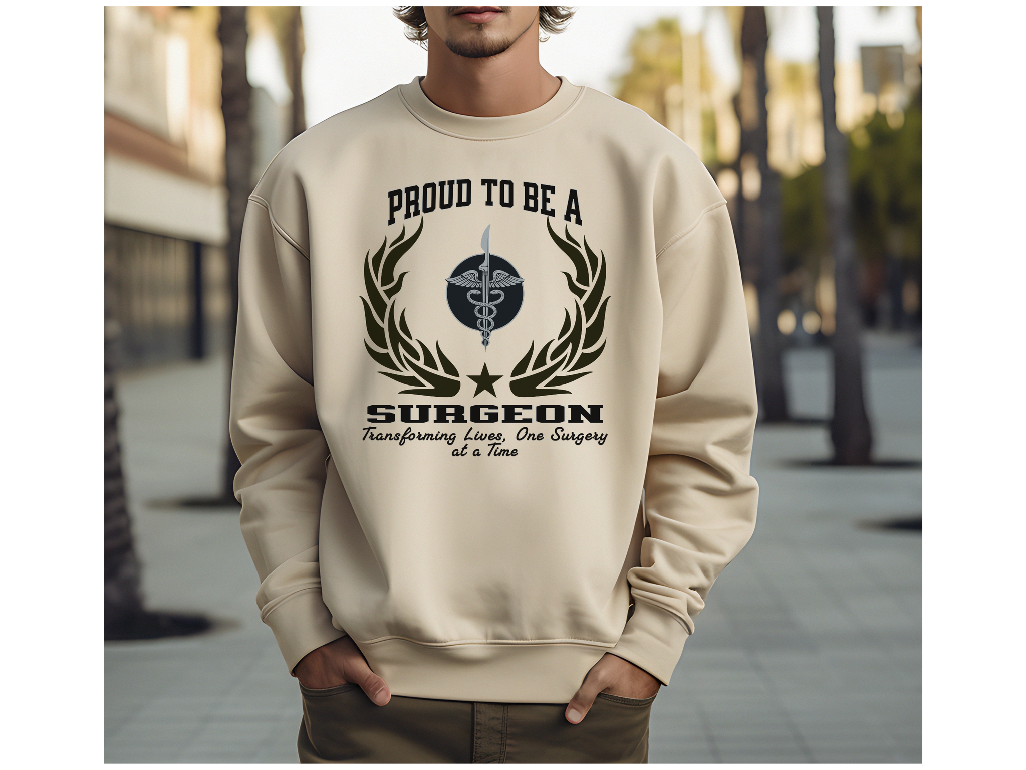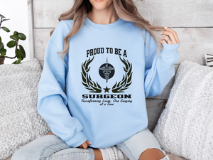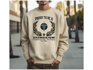 Honor your commitment to healing with our "Proud to be a SURGEON – Transforming Lives, One Surgery at a Time" unisex sweatshirt. Designed for the skilled hands and focused minds in the operating room, this cozy crewneck blends comfort with purpose. Perfect for pre-op prep, post-shift relaxation, or weekend wear, it's a bold statement of your passion for saving lives and making a difference—one surgery at a time.