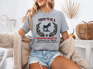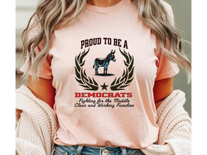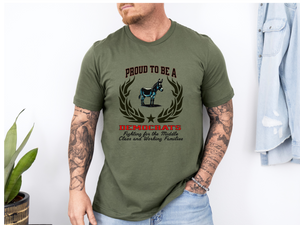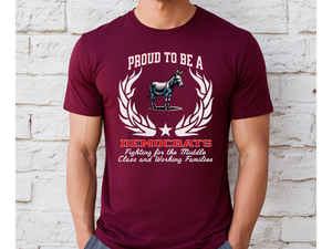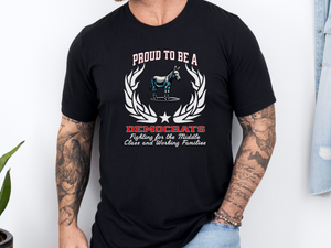 Wear your values with pride and purpose. Our "Proud to be a Democrat" unisex T-shirt showcases the powerful slogan "Fighting for the Middle Class and Working Families" — a bold statement for those who stand for equity, opportunity, and progress.