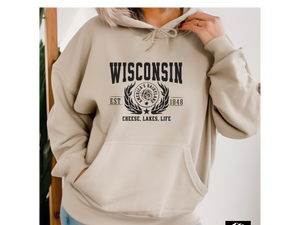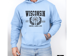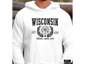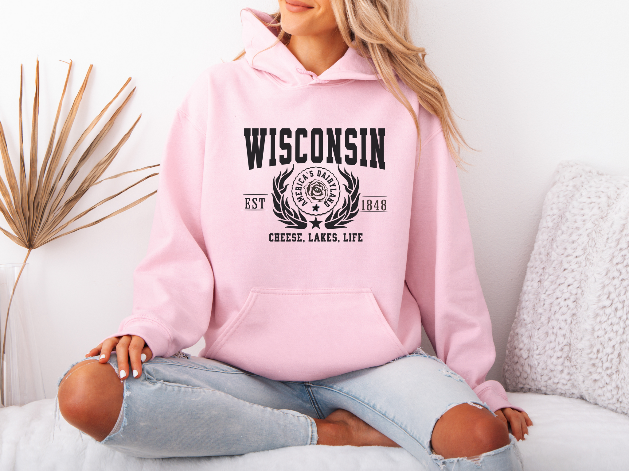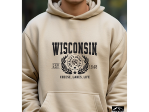 Celebrate the best of the Badger State with our State Legacy Unisex Hoodie, featuring the iconic slogan "Wisconsin, Cheese, Lakes, Life"! This cozy hoodie embodies everything that makes WI special—from the dairy farms of Door County and the shores of Lake Michigan to the electric energy of Packers game days and Friday night fish fries.