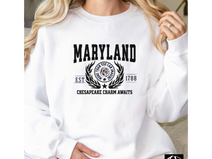 Celebrate the coastal beauty and timeless character of Maryland with this State Legacy Unisex Sweatshirt. Featuring the proud slogan “Chesapeake Charm Awaits,” this cozy crewneck is inspired by the region’s rich maritime history, vibrant small towns, and unforgettable waterfront views.