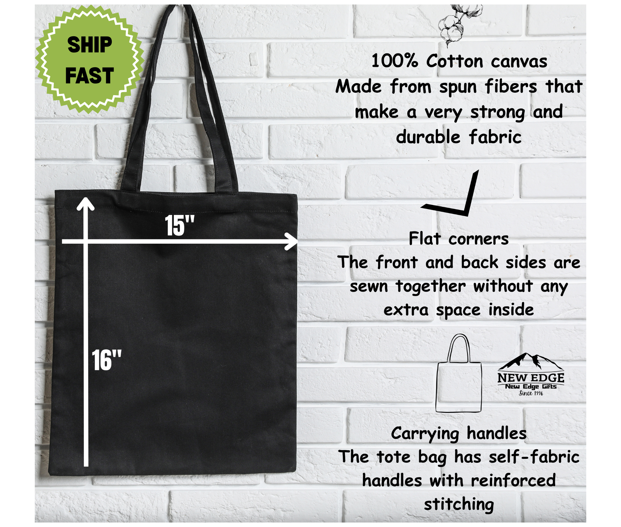 This 100% cotton bag comes in one size – 15" x 16"– perfect for everyday wear. While the canvas material will show off your designs in great colors, it's durable and will last for years. The bag features 20" handles (made from the same canvas), making it easy to carry even with a week's worth of shopping.