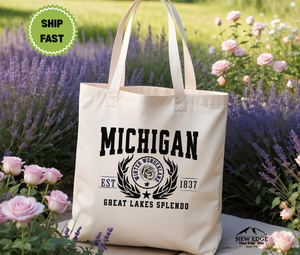 Celebrate the Great Lakes State with our Michigan State “Great Lakes Splendor” Cotton Canvas Tote Bag! Inspired by Michigan’s stunning shorelines, freshwater beauty, and adventurous spirit, this eco-friendly tote is perfect for those who love the outdoors, lake life, and state pride. Ideal for shopping, beach trips, or travel adventures, it’s both durable and stylish.