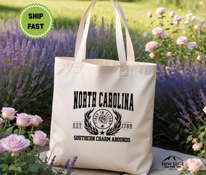 Celebrate the warmth and beauty of the Tar Heel State with our North Carolina State “Southern Charm Abounds” Cotton Canvas Tote Bag! Designed to capture North Carolina’s rich heritage, coastal beauty, and genuine hospitality, this eco-friendly tote is perfect for everyday errands, weekend trips, or as a meaningful keepsake. Whether you’re exploring the Outer Banks, hiking the Blue Ridge Mountains, or shopping downtown, this durable tote brings southern style wherever you go.