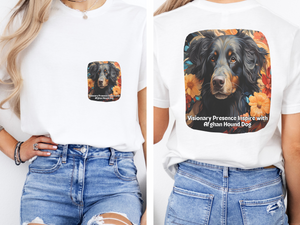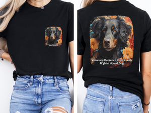 Embody the regal elegance of the Afghan Hound with this luxurious sunflower T-shirt! Featuring the inspirational slogan "Visionary Presence – Inspire with Afghan Hound Grace" on the front and a breathtaking full-back design of a flowing-coated Afghan standing majestic among golden sunflowers, this tee captures the breed’s aristocratic beauty, ancient lineage, and quiet wisdom.