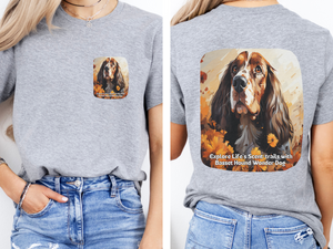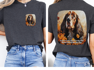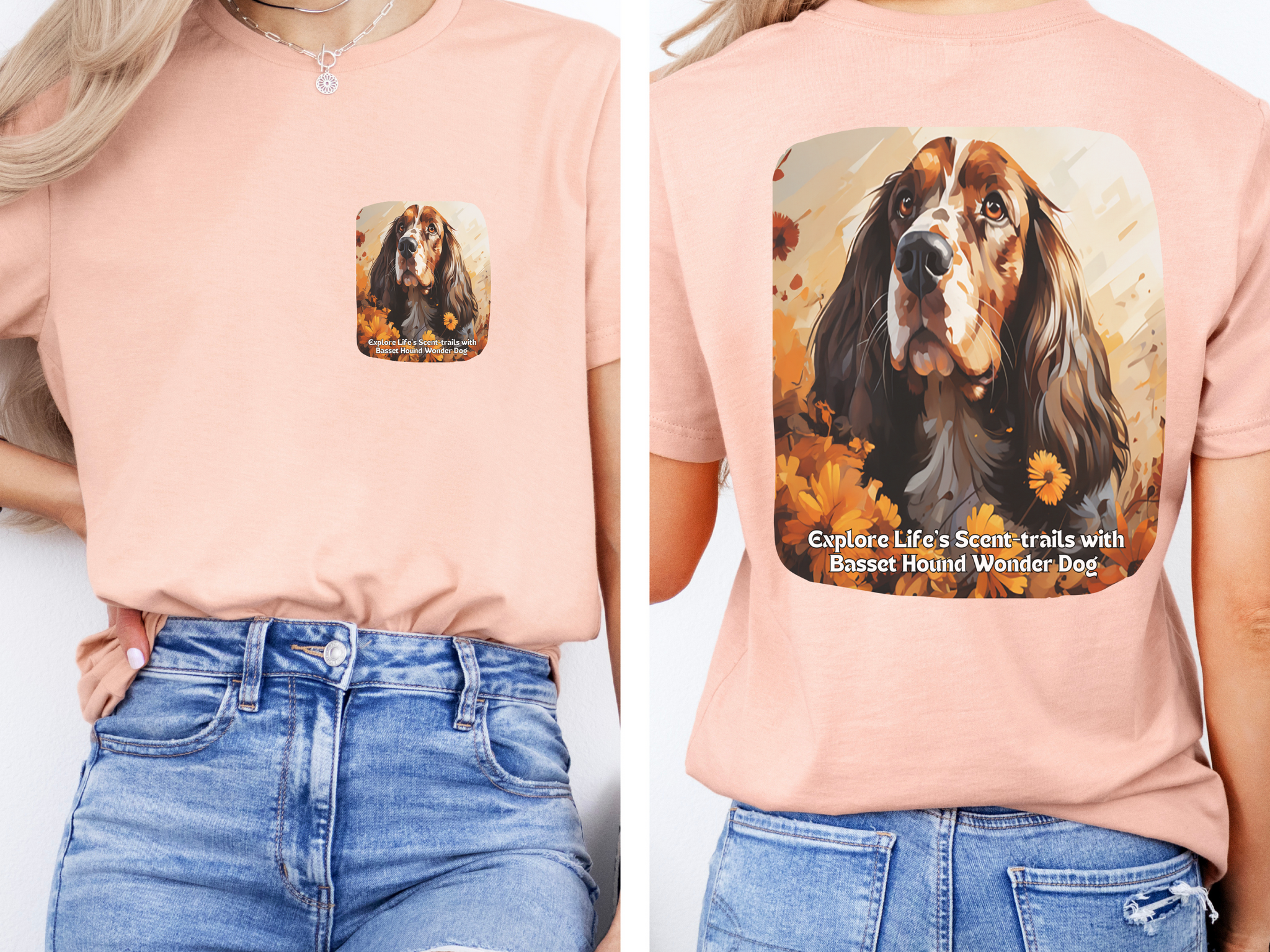 Follow your nose to adventure with this sunflower-themed unisex T-shirt celebrating the Basset Hound's extraordinary scenting superpowers! Featuring the playful slogan "Explore Life's Scent-trails with Basset Hound Wonder" on the front and a detailed full-back design of a determined Basset Hound tracking through a golden sunflower field, this tee captures everything we love about these droopy-eared detectives.