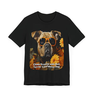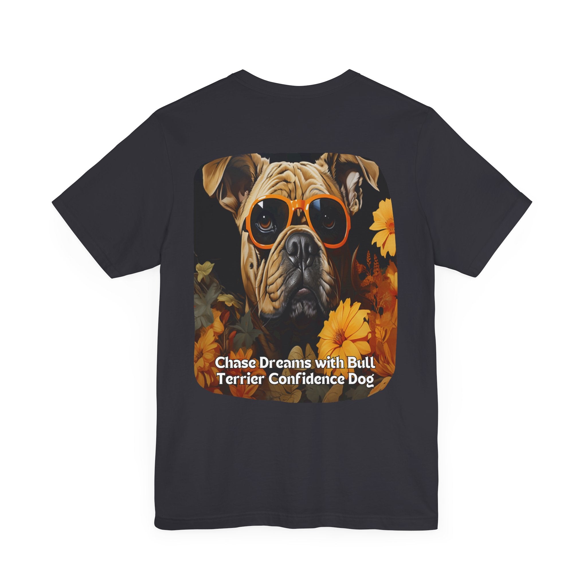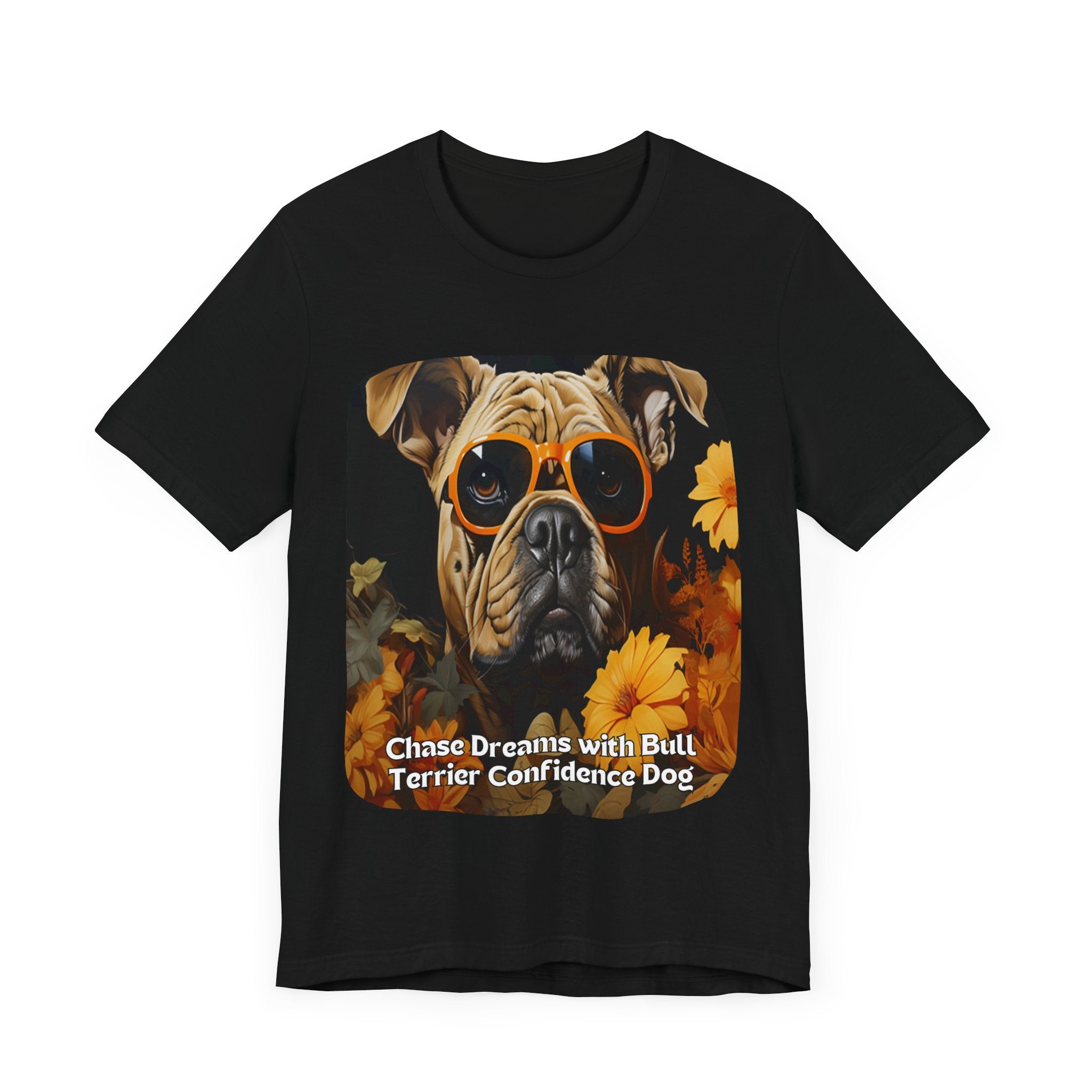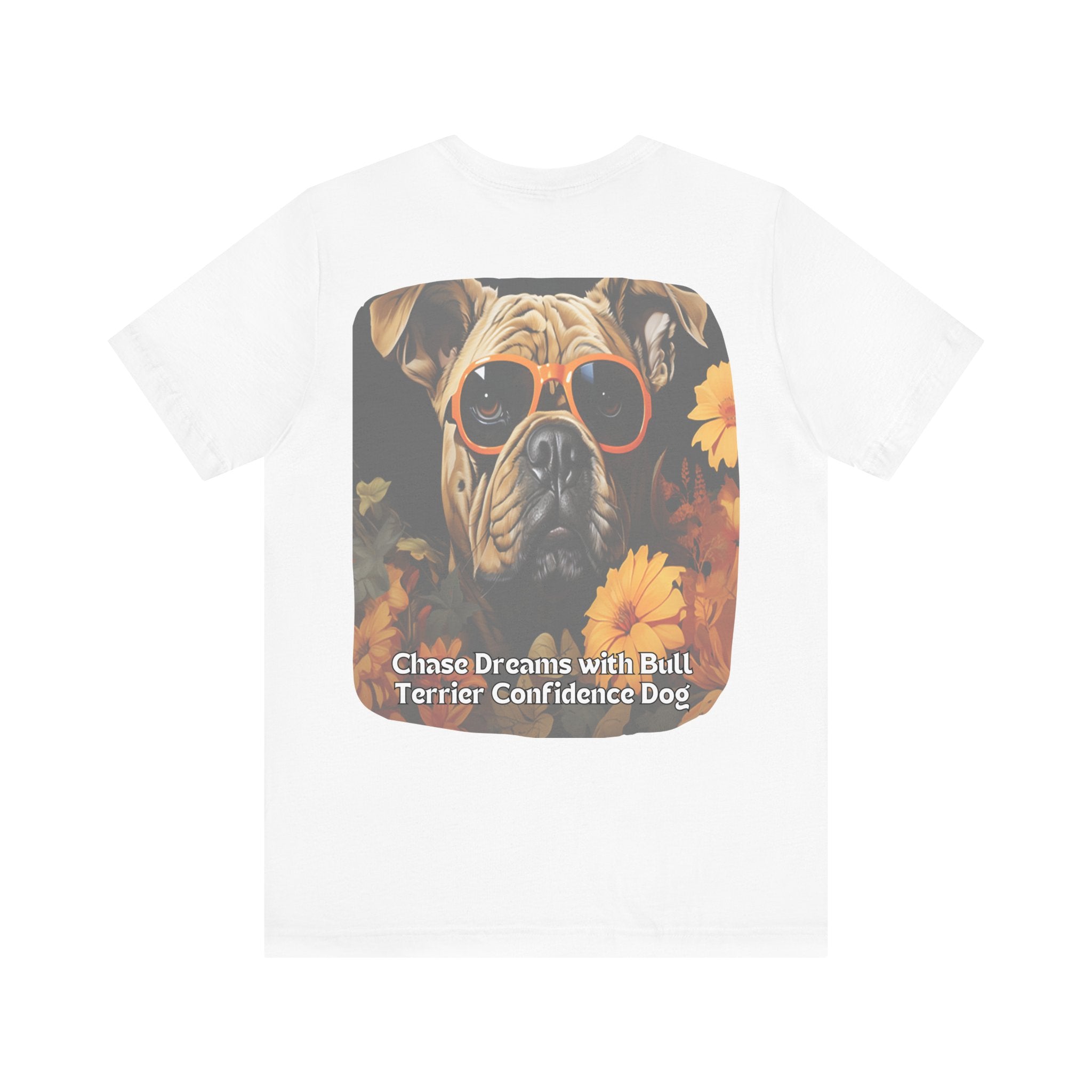 Unleash your inner determination with this sunflower-themed unisex T-shirt celebrating the fearless spirit of the Bull Terrier! Featuring the empowering slogan "Chase Dreams with Bull Terrier Confidence" on the front and a striking full-back design of a proud Bull Terrier surrounded by golden sunflowers, this tee embodies the breed’s signature courage, tenacity, and playful charm.