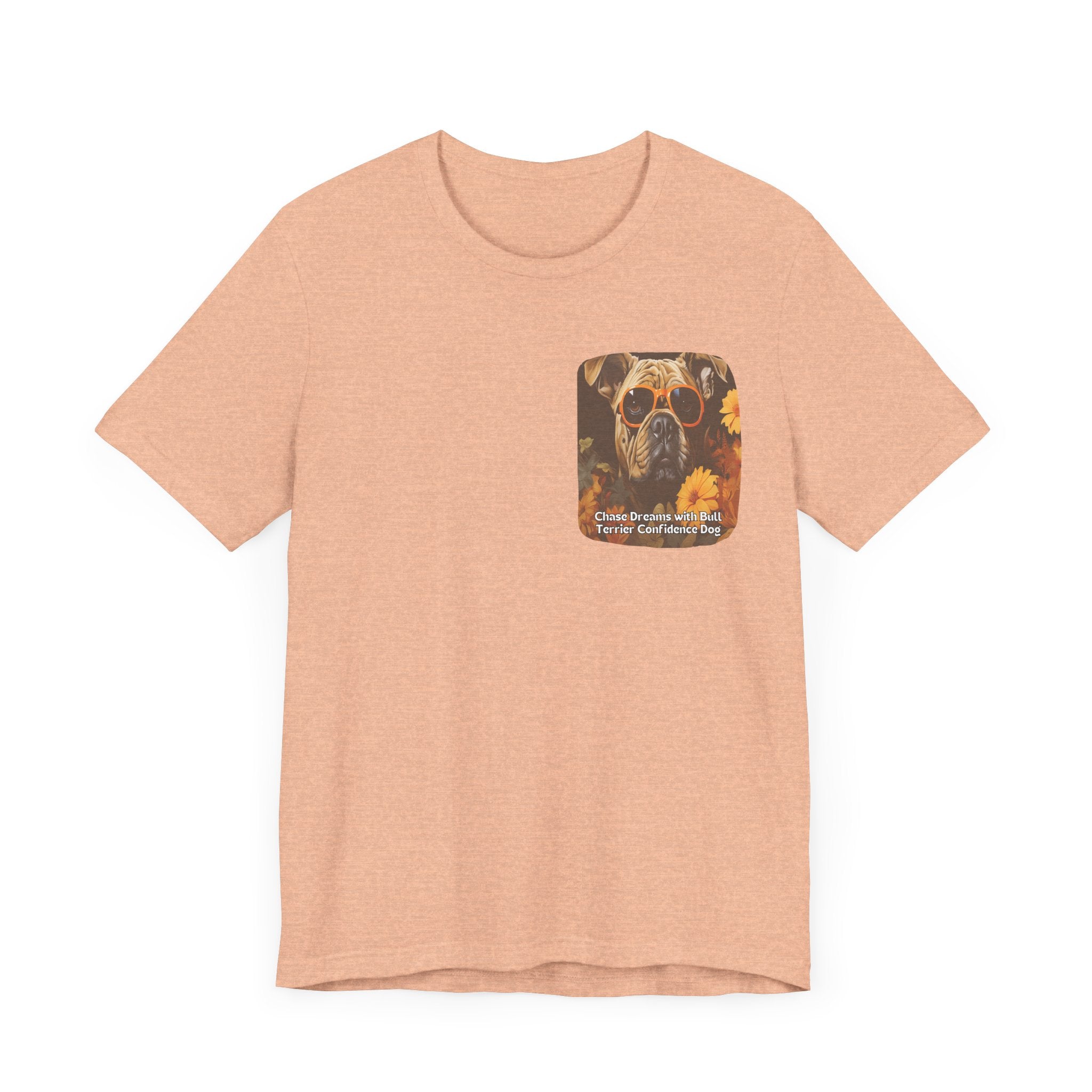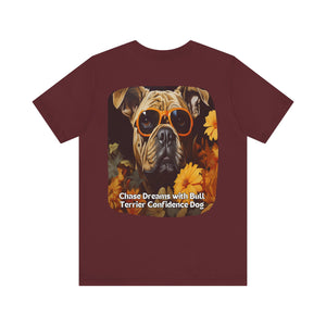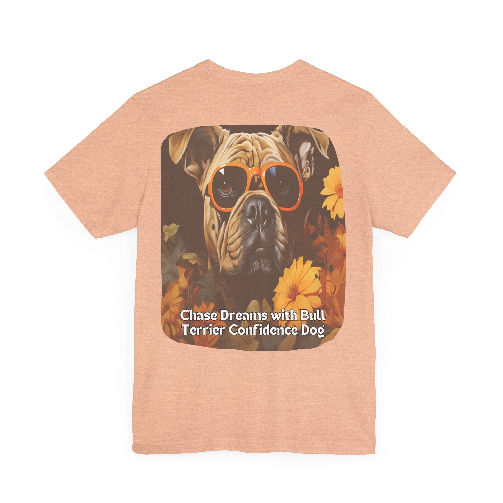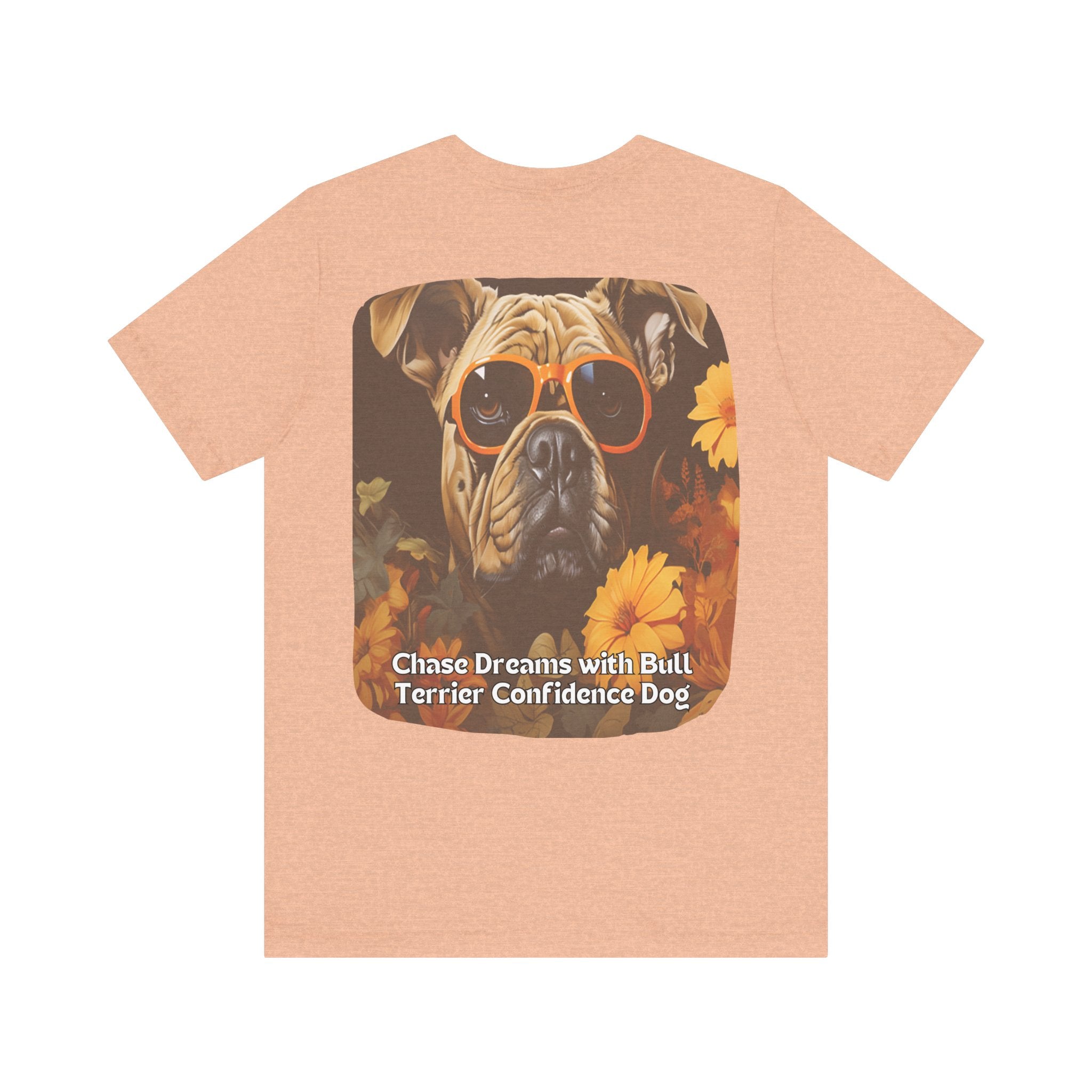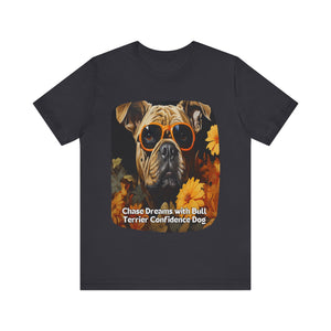 Unleash your inner determination with this sunflower-themed unisex T-shirt celebrating the fearless spirit of the Bull Terrier! Featuring the empowering slogan "Chase Dreams with Bull Terrier Confidence" on the front and a striking full-back design of a proud Bull Terrier surrounded by golden sunflowers, this tee embodies the breed’s signature courage, tenacity, and playful charm.