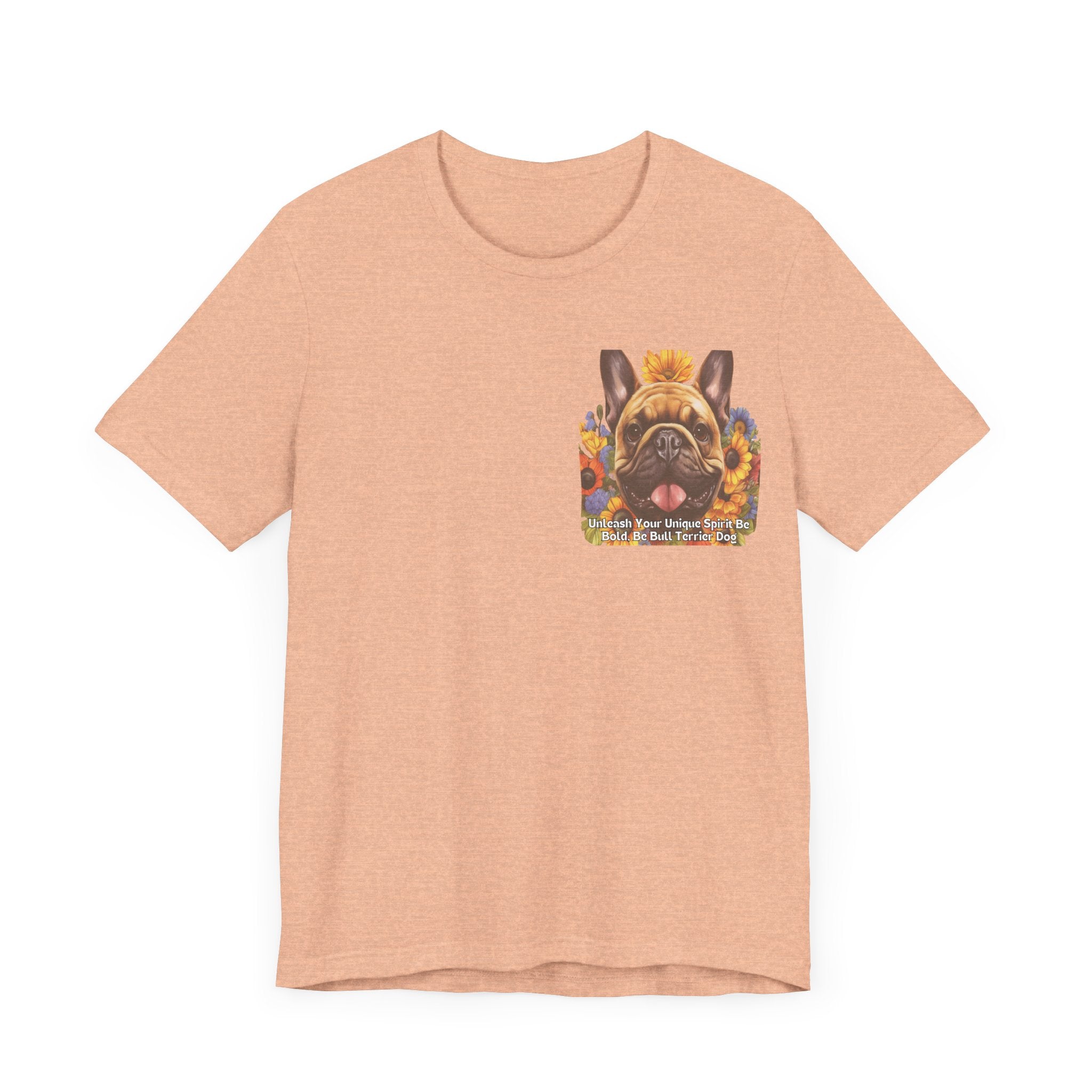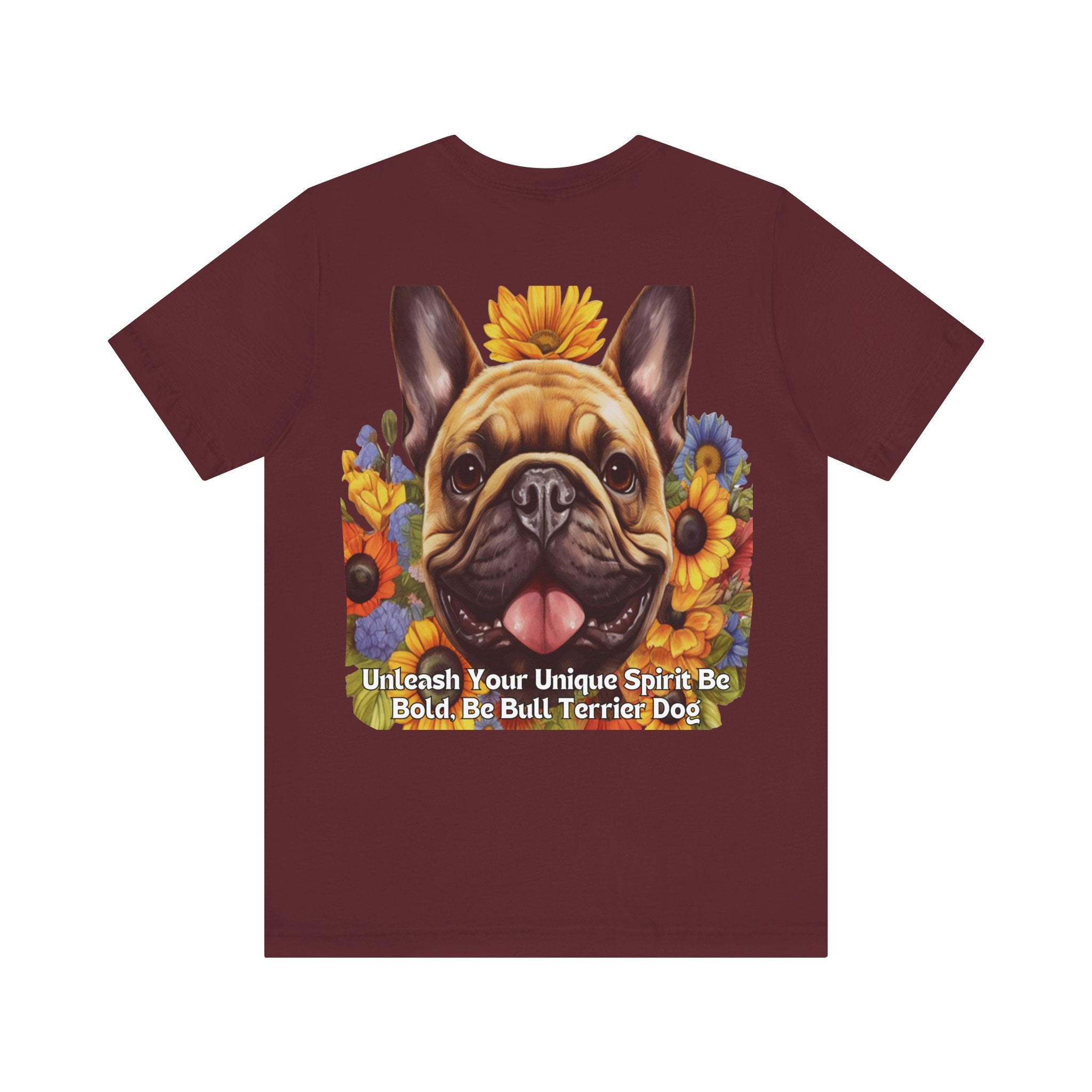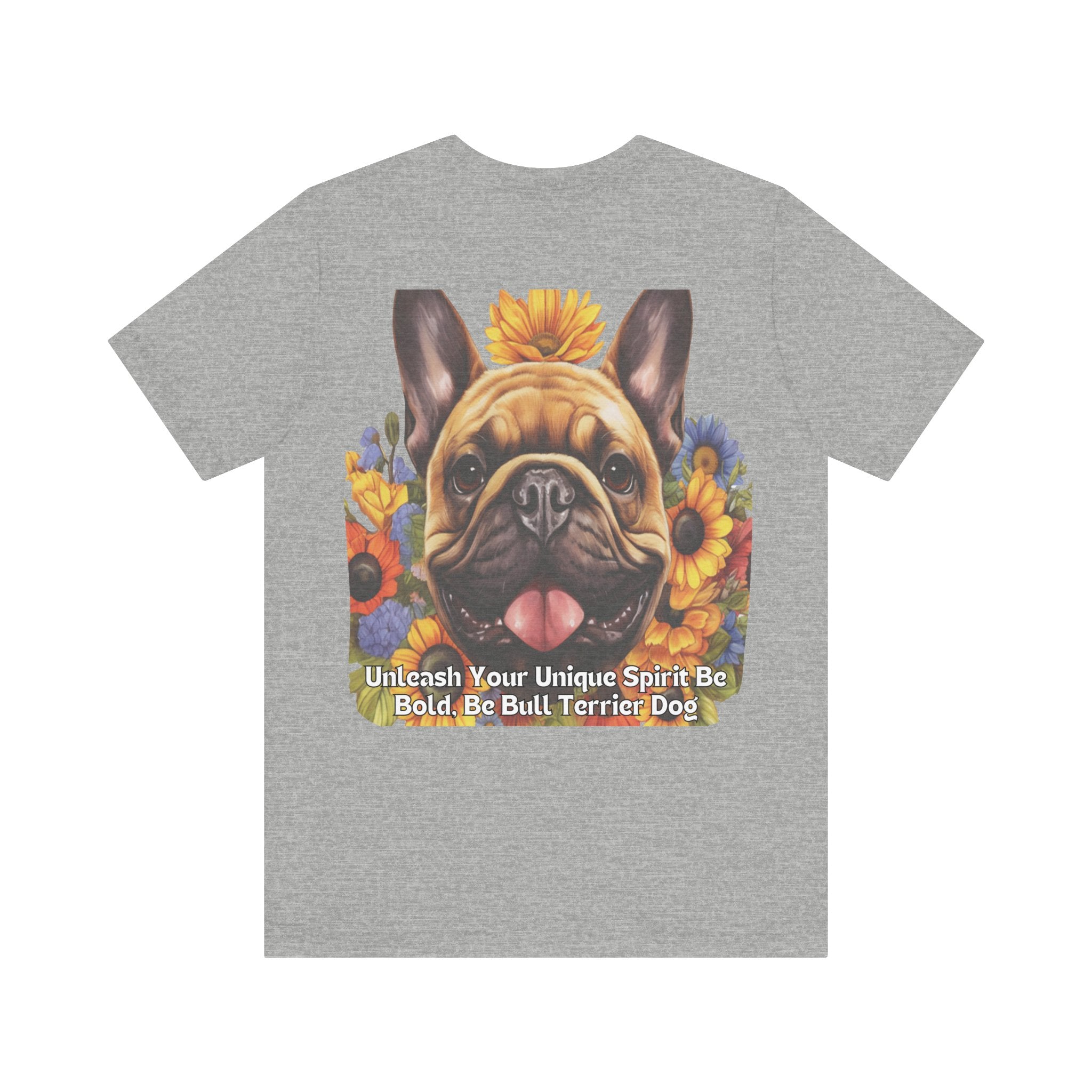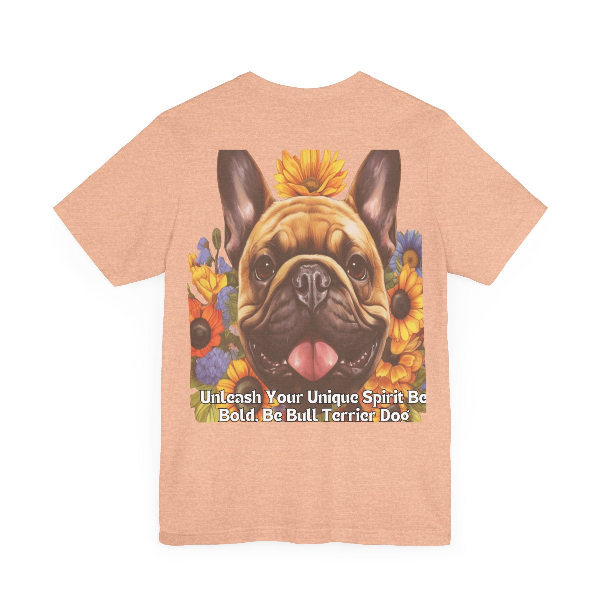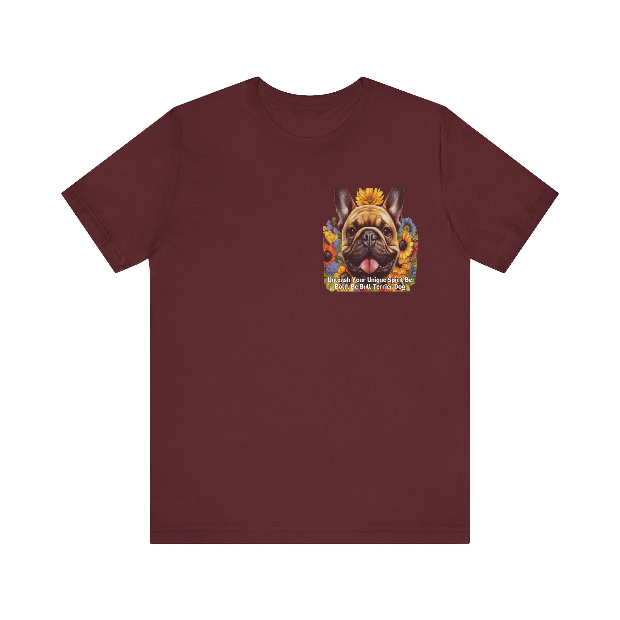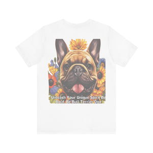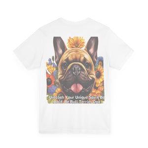 Celebrate the one-of-a-kind personality of the Bull Terrier with this eye-catching sunflower T-shirt! Featuring the bold slogan "Unleash Your Unique Spirit – Be Bold, Be Bull Terrier" on the front and a playful full-back design of a confident Bull Terrier striking a pose among golden sunflowers, this tee embodies the breed’s signature egg-shaped head, mischievous charm, and unstoppable zest for life.